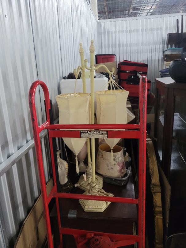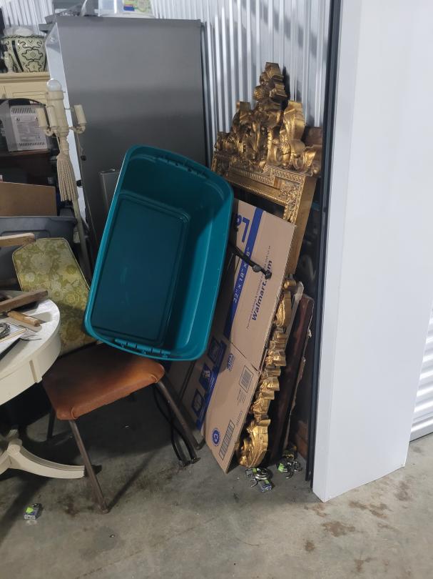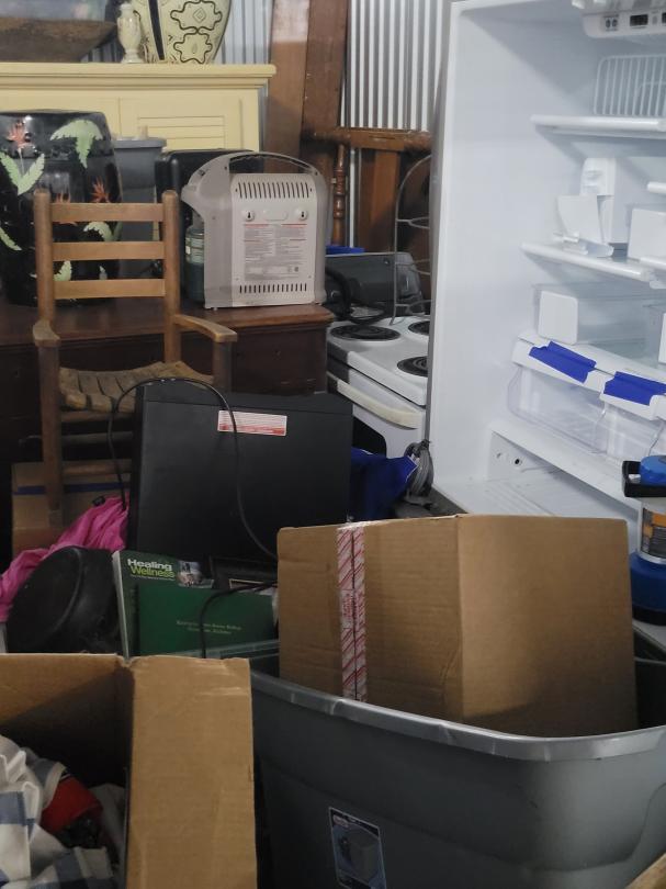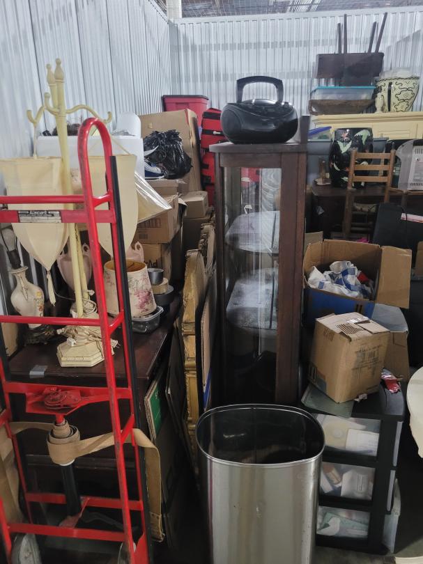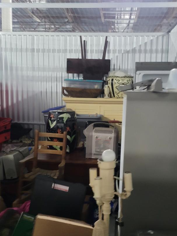 This unit appears to contain…Stove, fridge, bedframe, dresser, lamps, chairs, table, decor, totes, boxes, suitcases, misc.