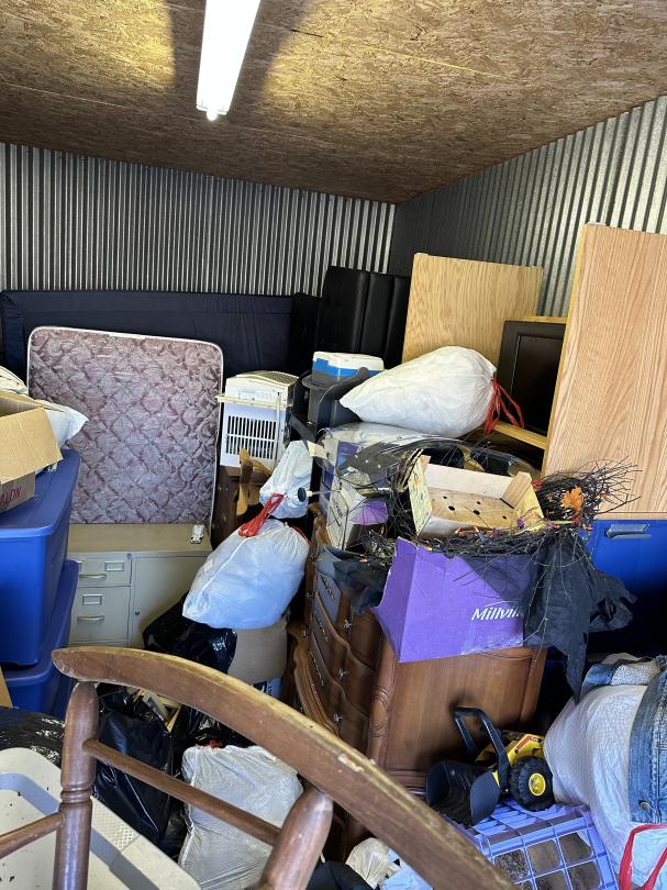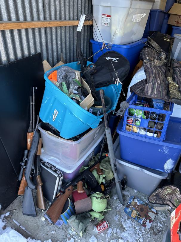 This unit appears to contain…wooden rocking chair, Rifles, Firearms, guns, mattress, TV stand, filing cabinet, Archery bow, hunting equipment