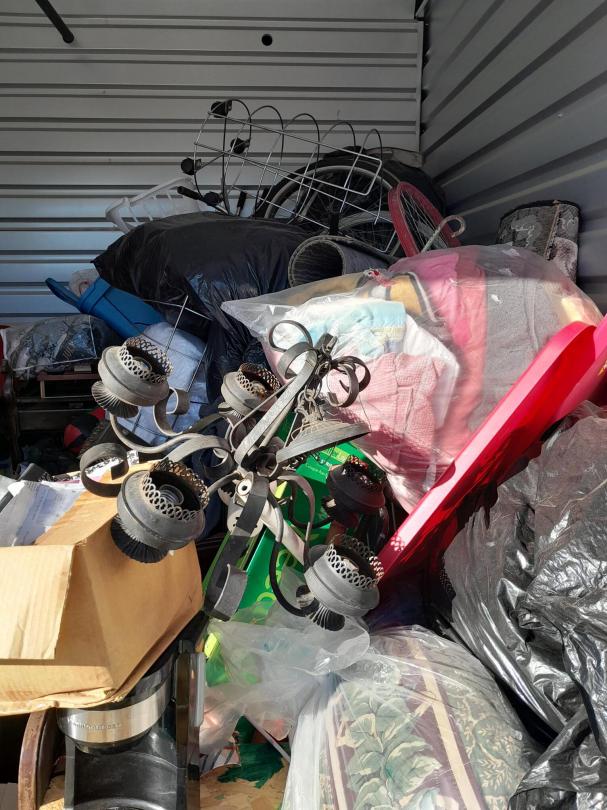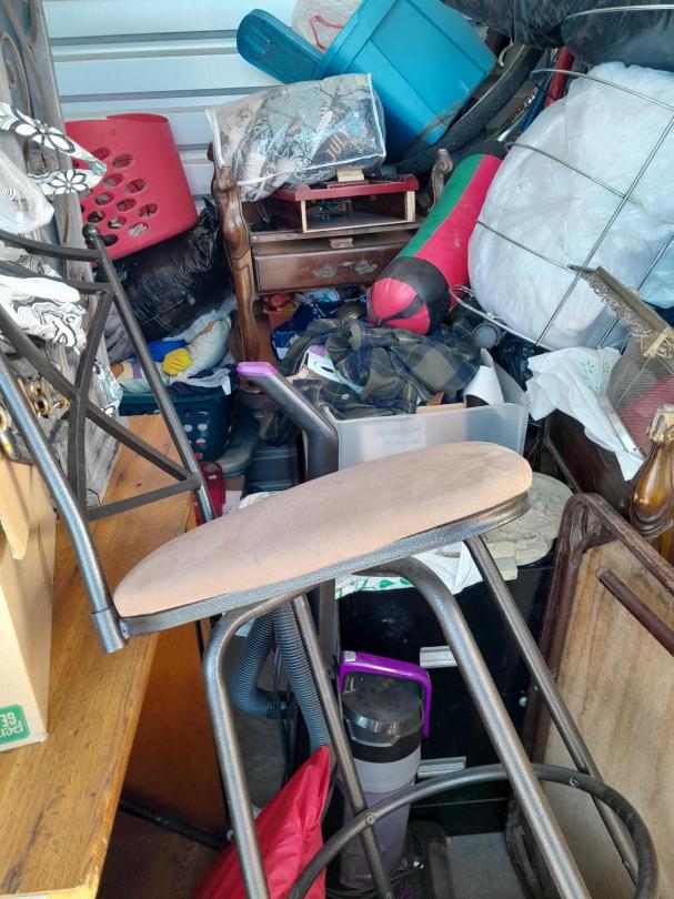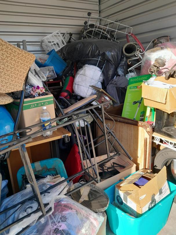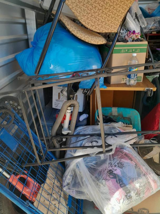This unit appears to contain…Vacuums, Chairs, Tables, Bicycle, totes, rolling carts, racks, boxes, rugs, clothes, tires, bags