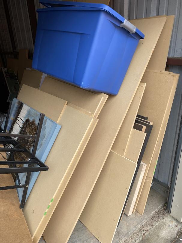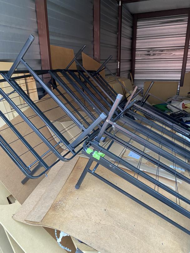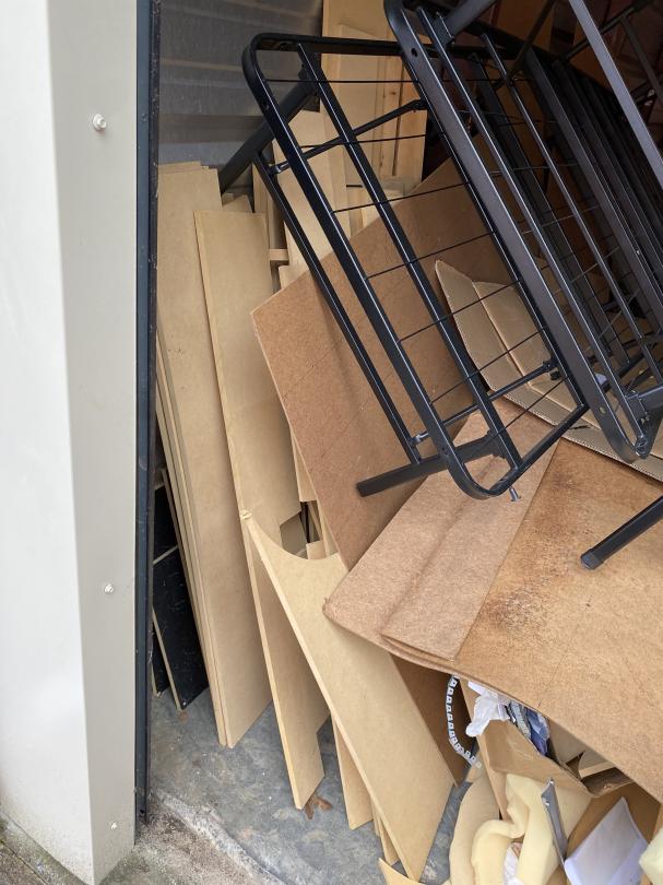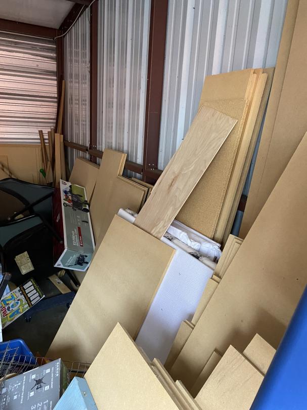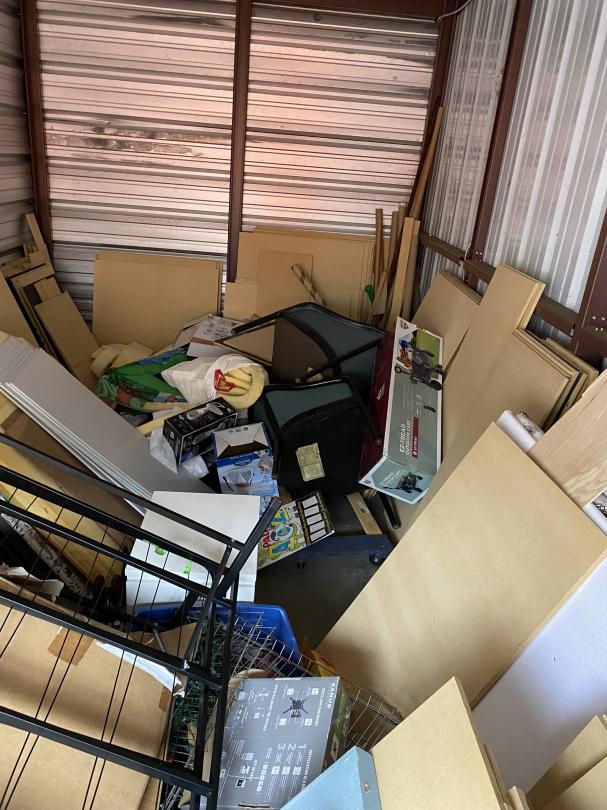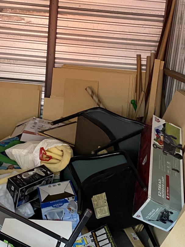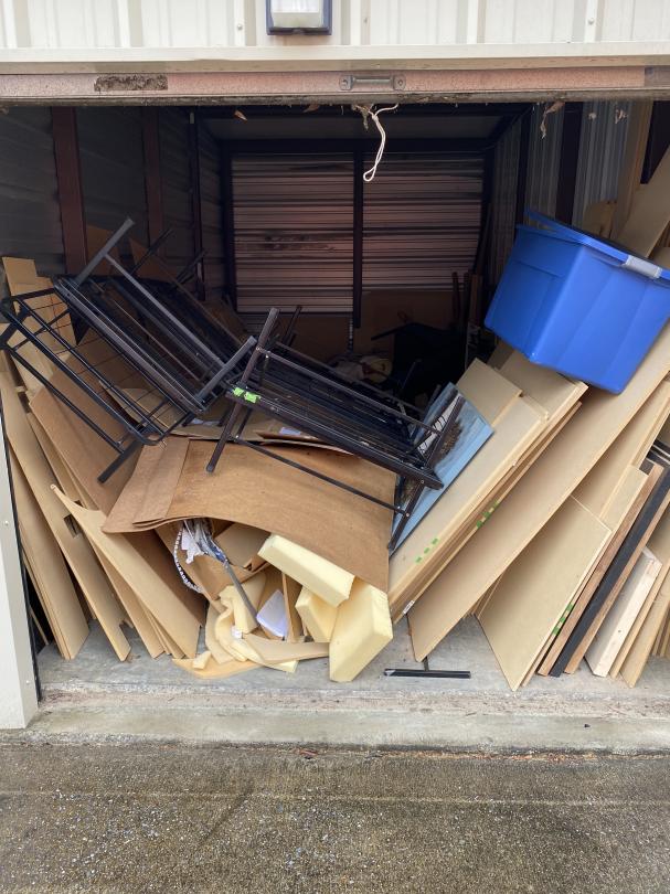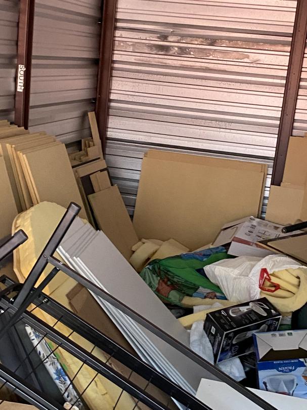 This unit appears to contain…Bed frames, chairs, totes, particle board, boxes, foam, art work, decorations