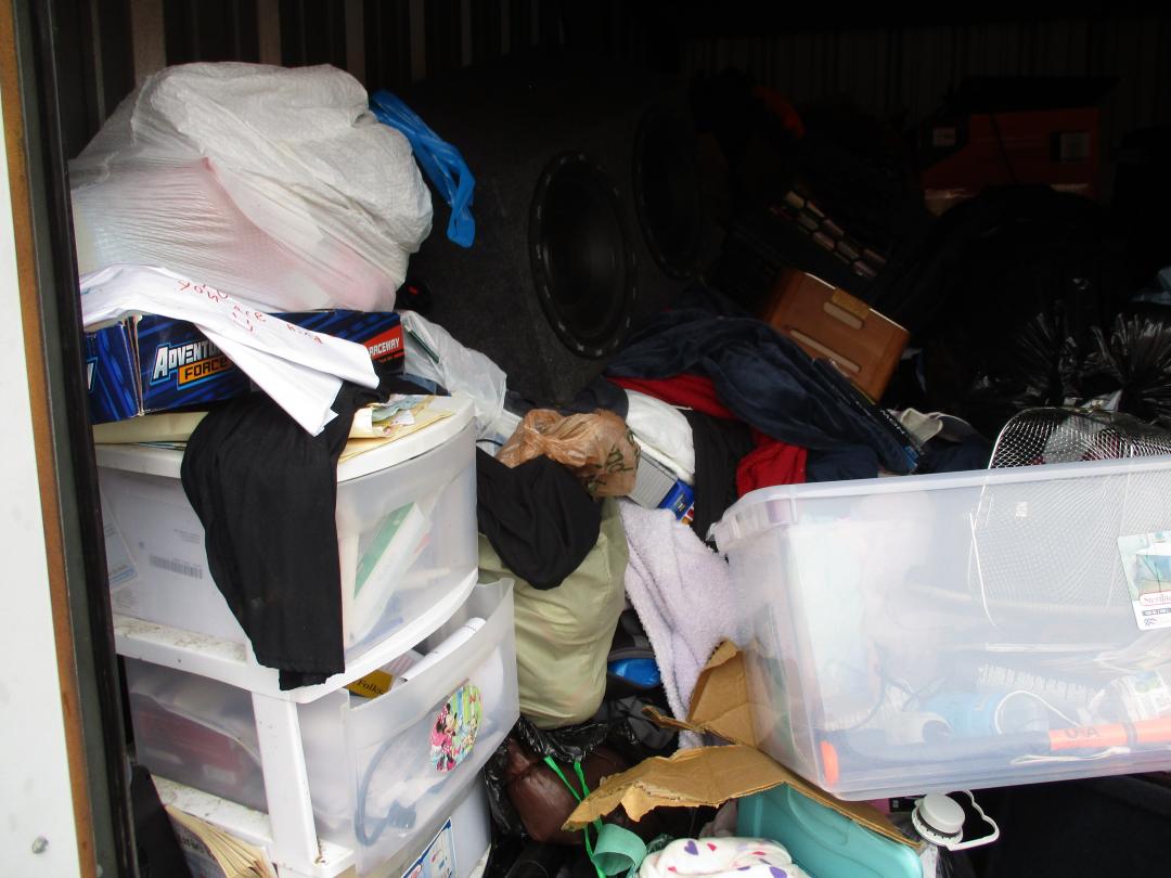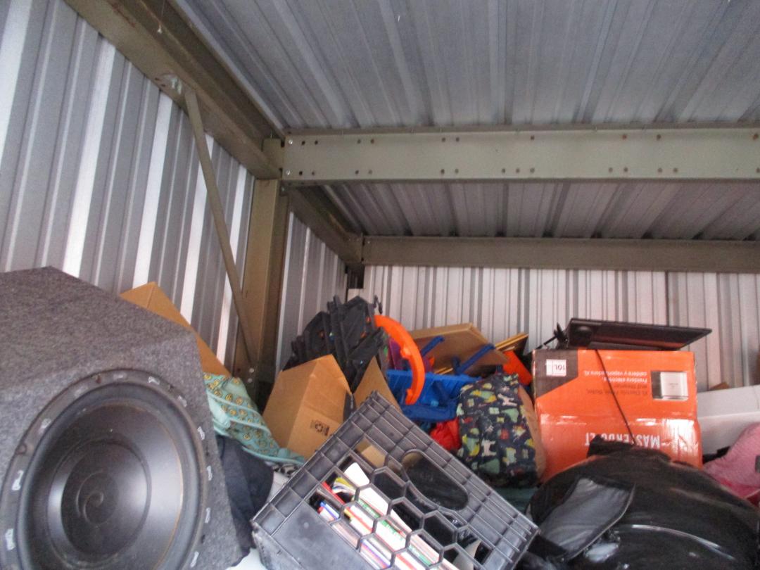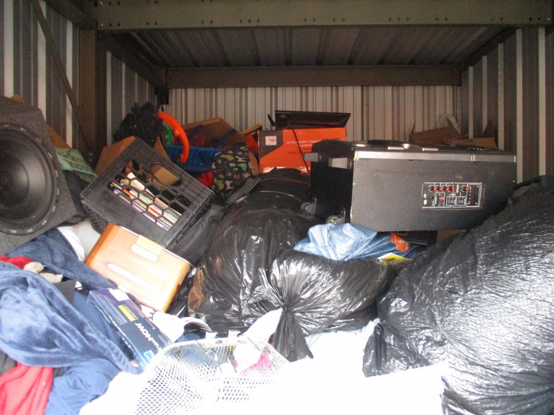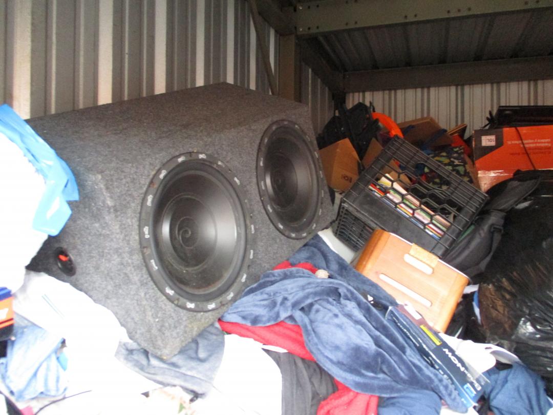 This unit appears to contain…plastic bags, plastic containers, misc boxes, clothing, stereo speakers