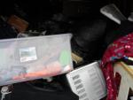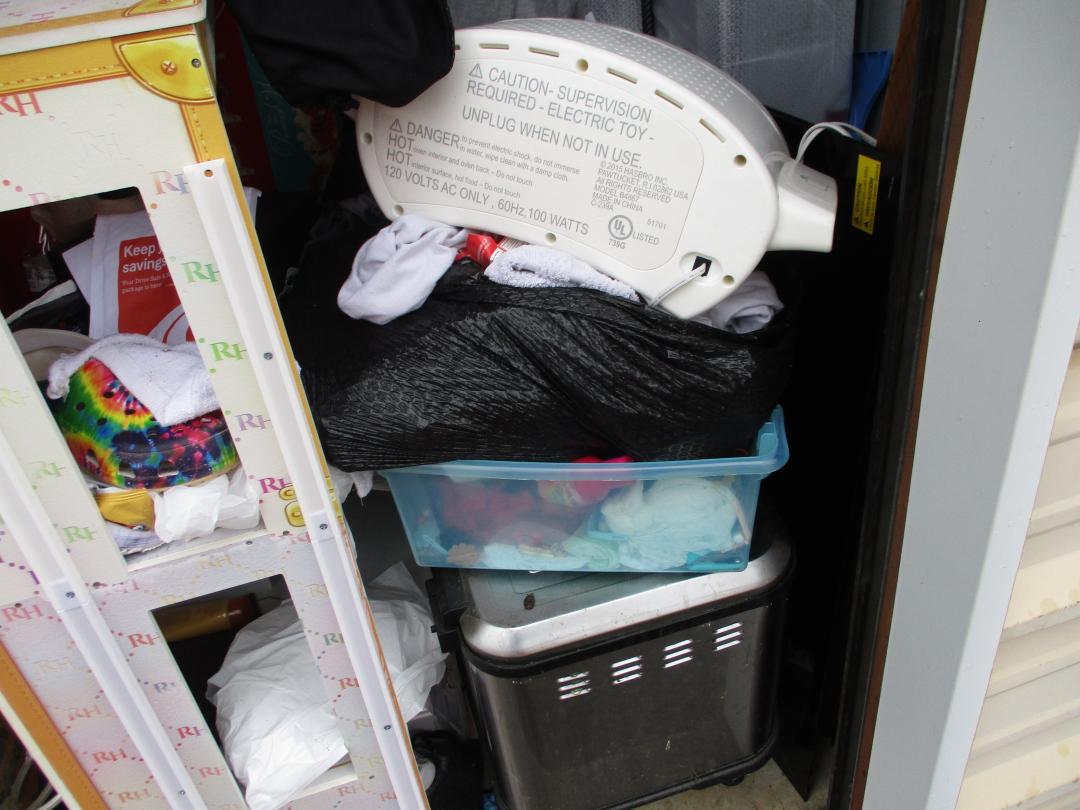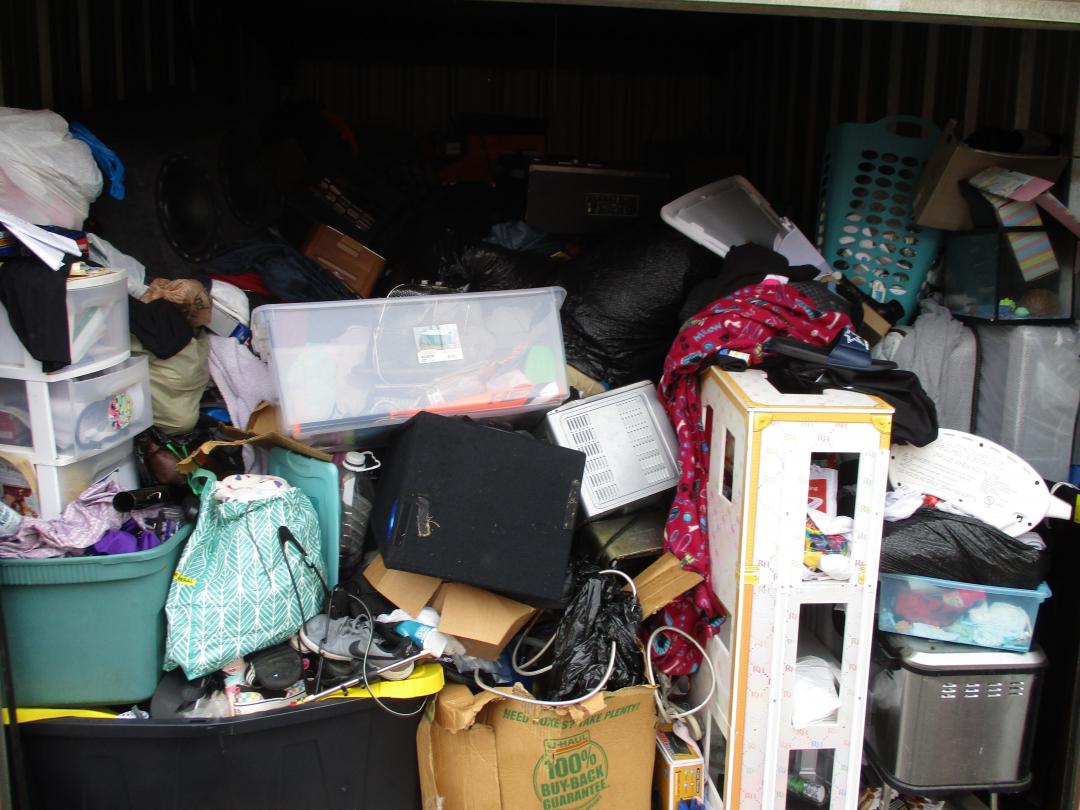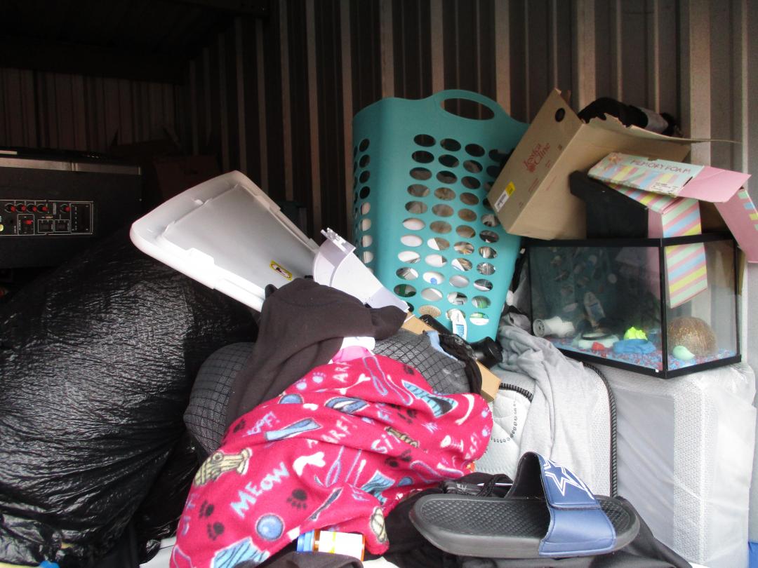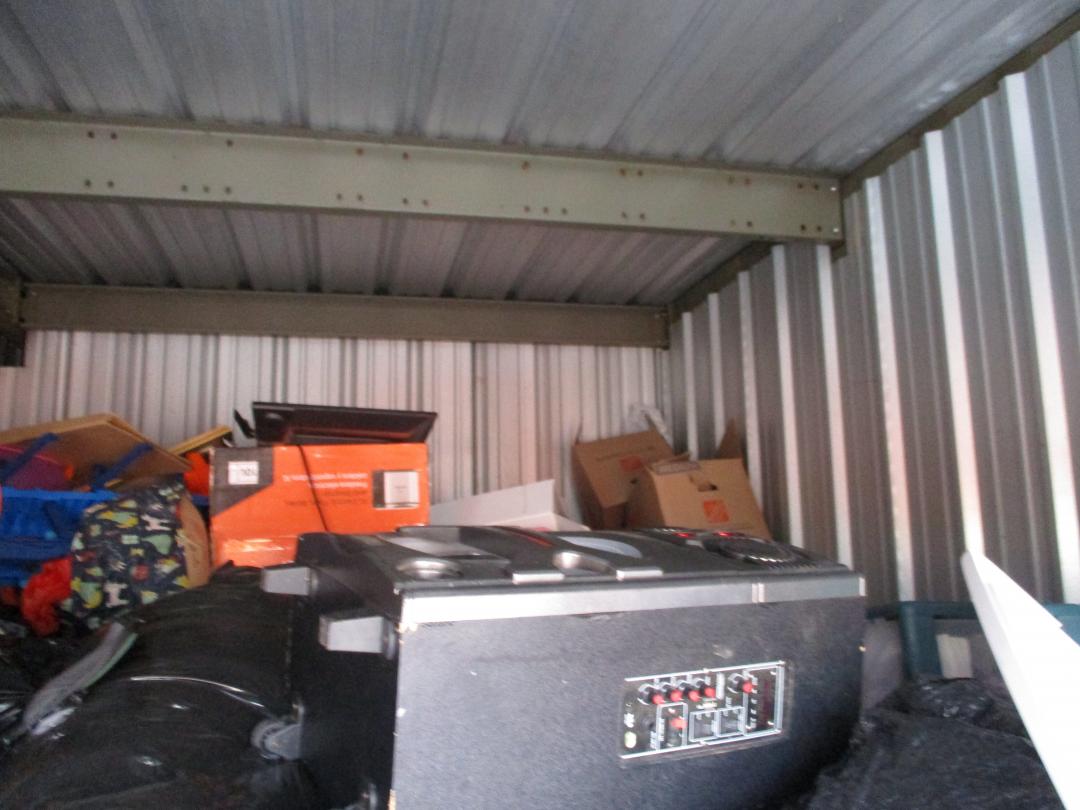 This unit appears to contain…plastic bags, plastic containers, misc boxes, clothing, stereo speakers