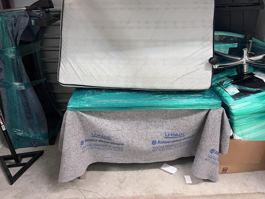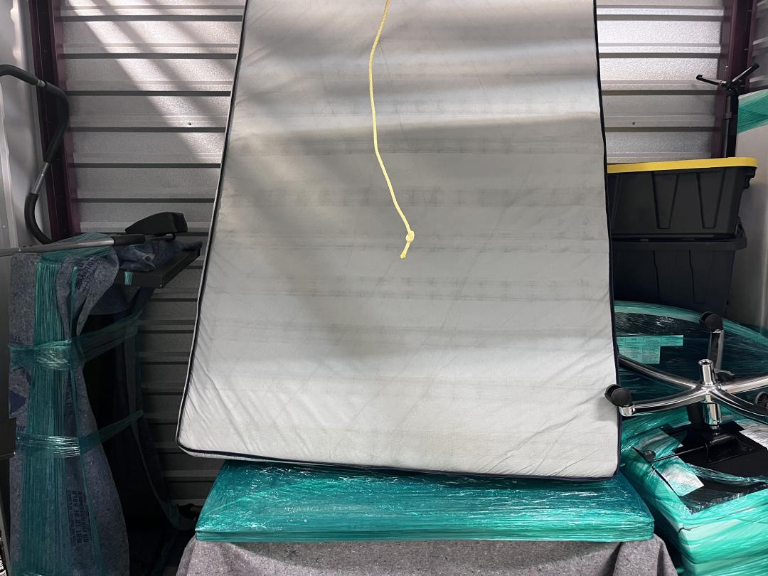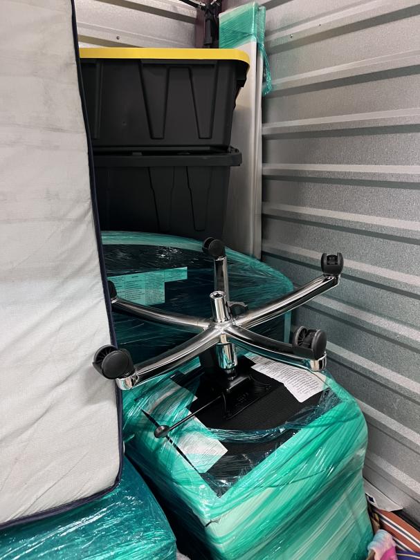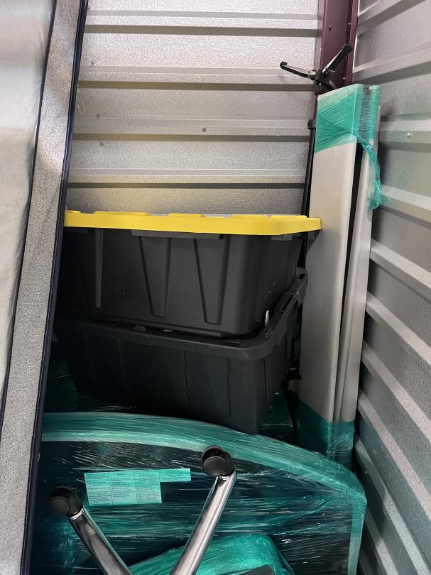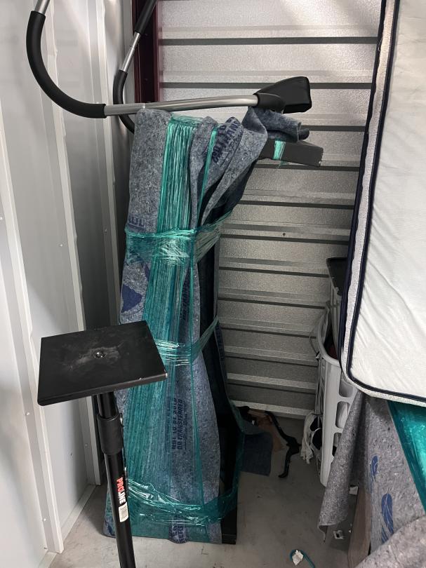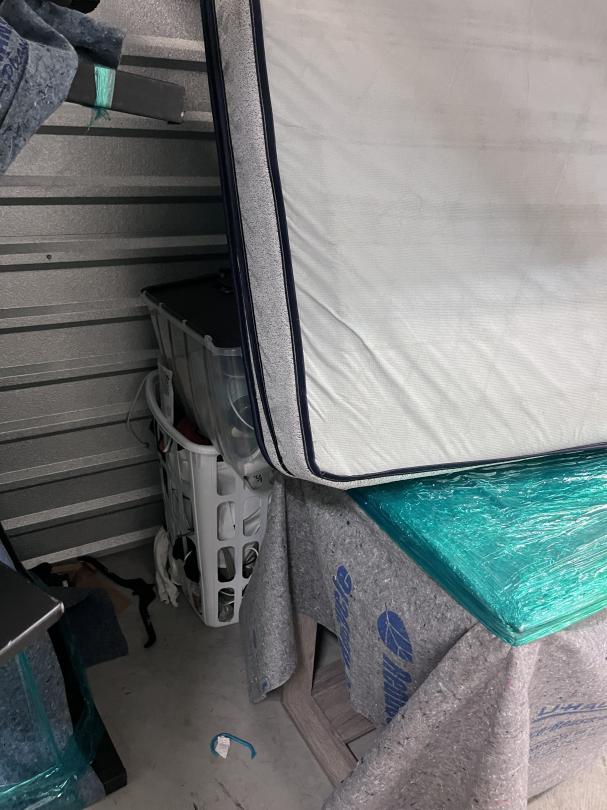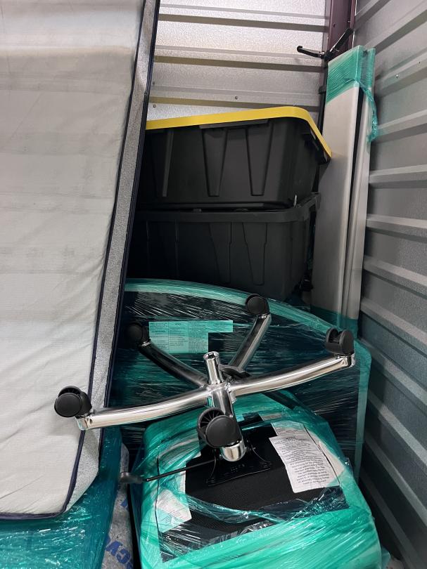 This unit appears to contain…5x10 temp controlled unit appears to contain a headboard, mattress, clothing, chair ProLine stand, plastic totes, and a hamper