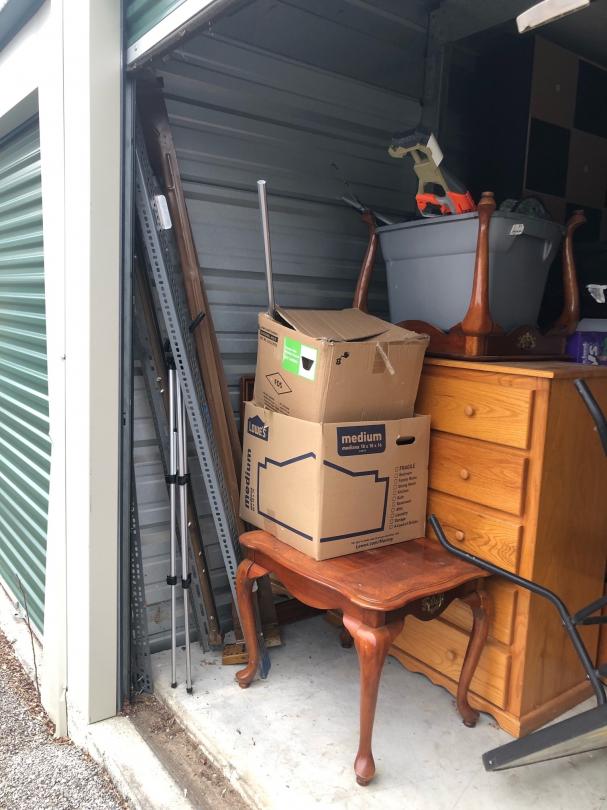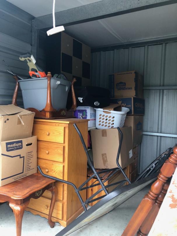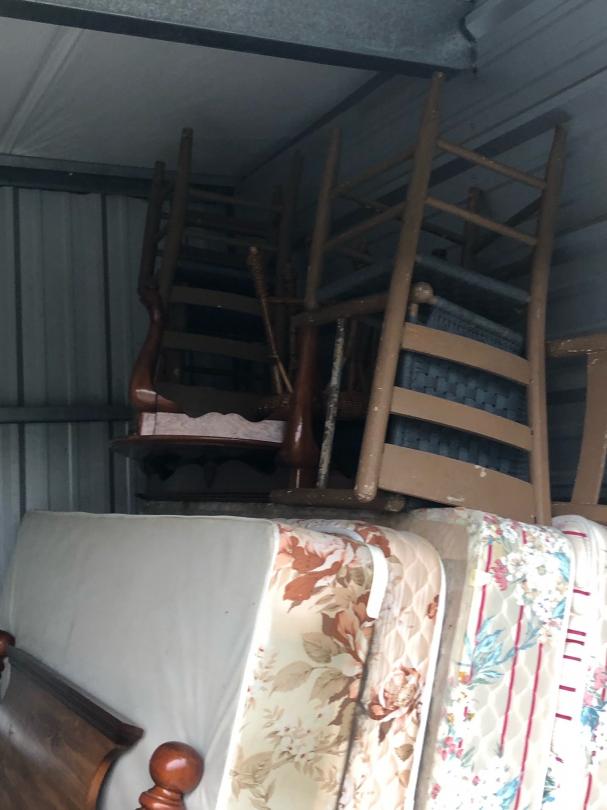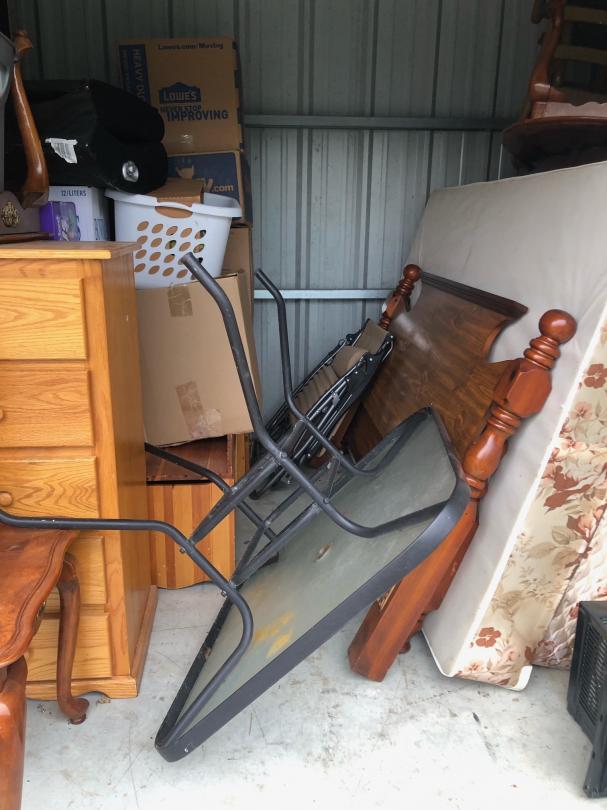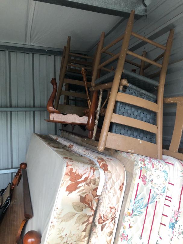 This unit appears to contain…This unit appears to contain mattresses, furniture, dresser, end table bed frame, chairs, table, fan, boxes, hamper, totes, and other miscellaneous items.