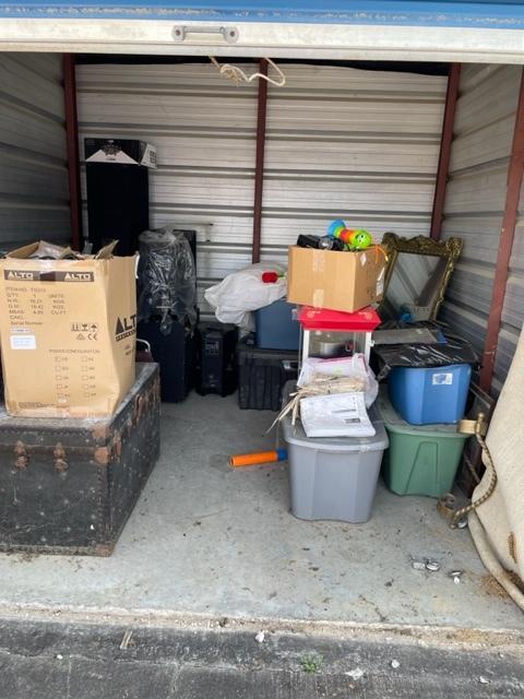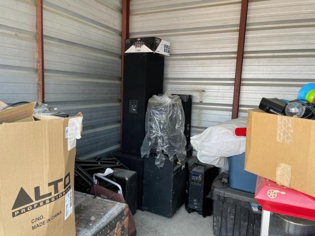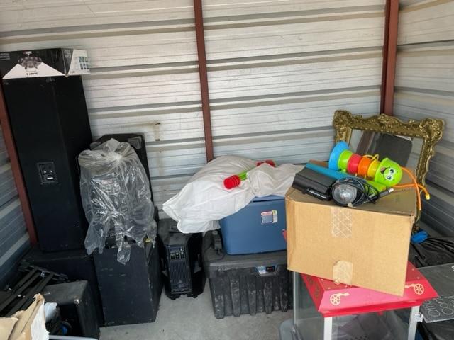 This unit appears to contain…This unit contains a cedar chest, glass top coffee table, totes, popcorn machine, Amp, 3 speakers , Mixing board, Baby bouncer, and misc. music equipment.