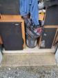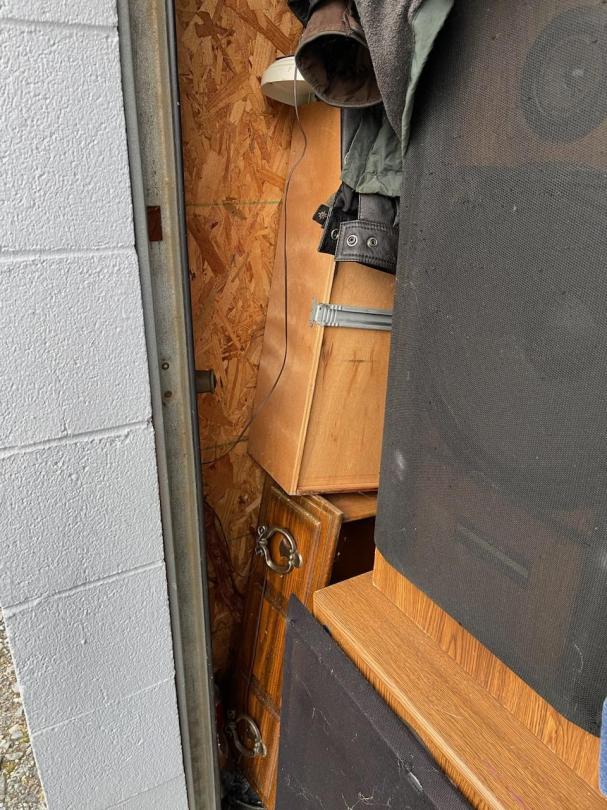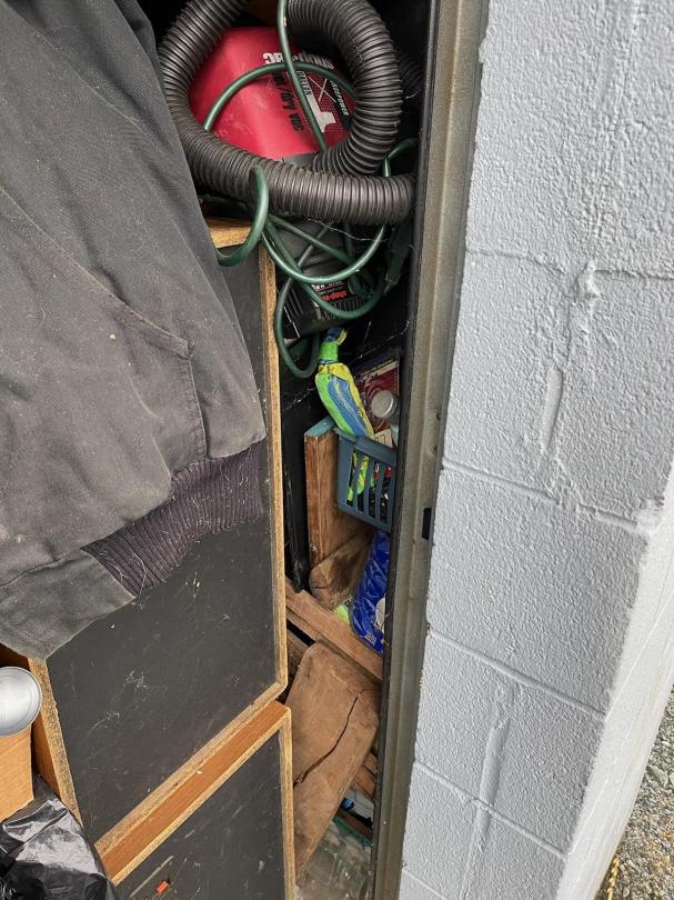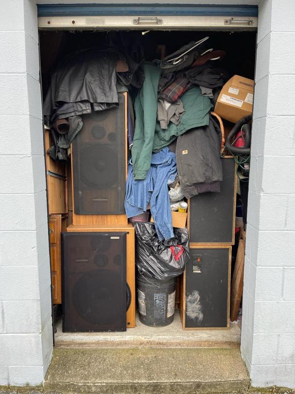 This unit appears to contain…Stand up speakers, shop-vac, clothes, bags