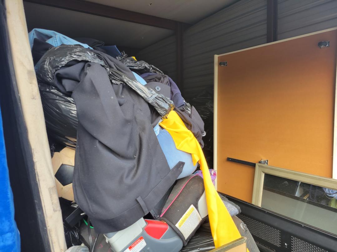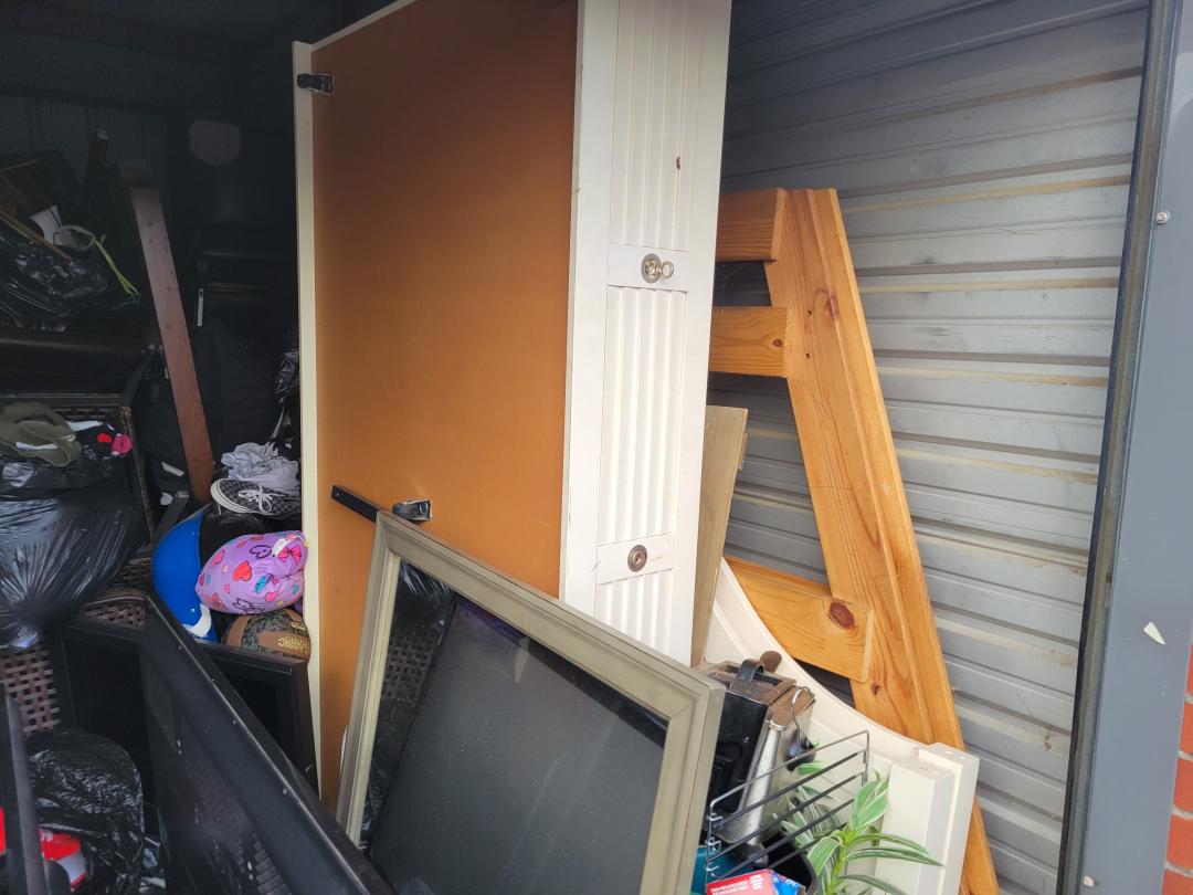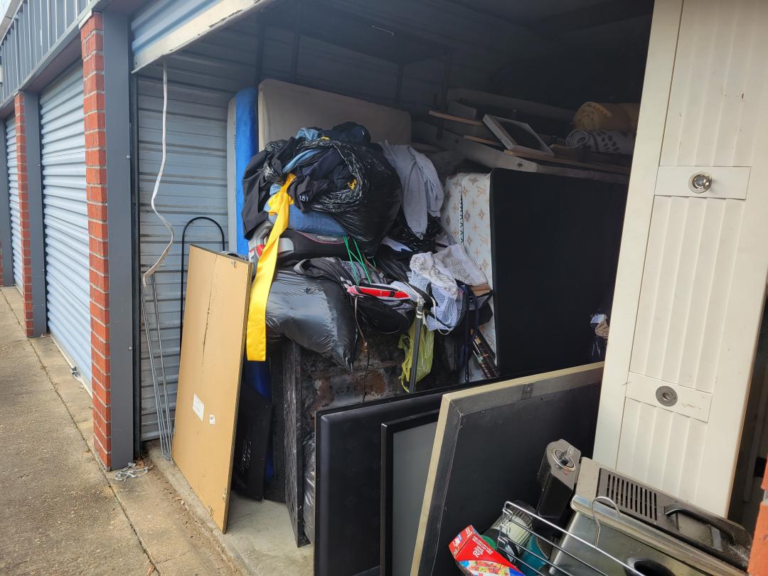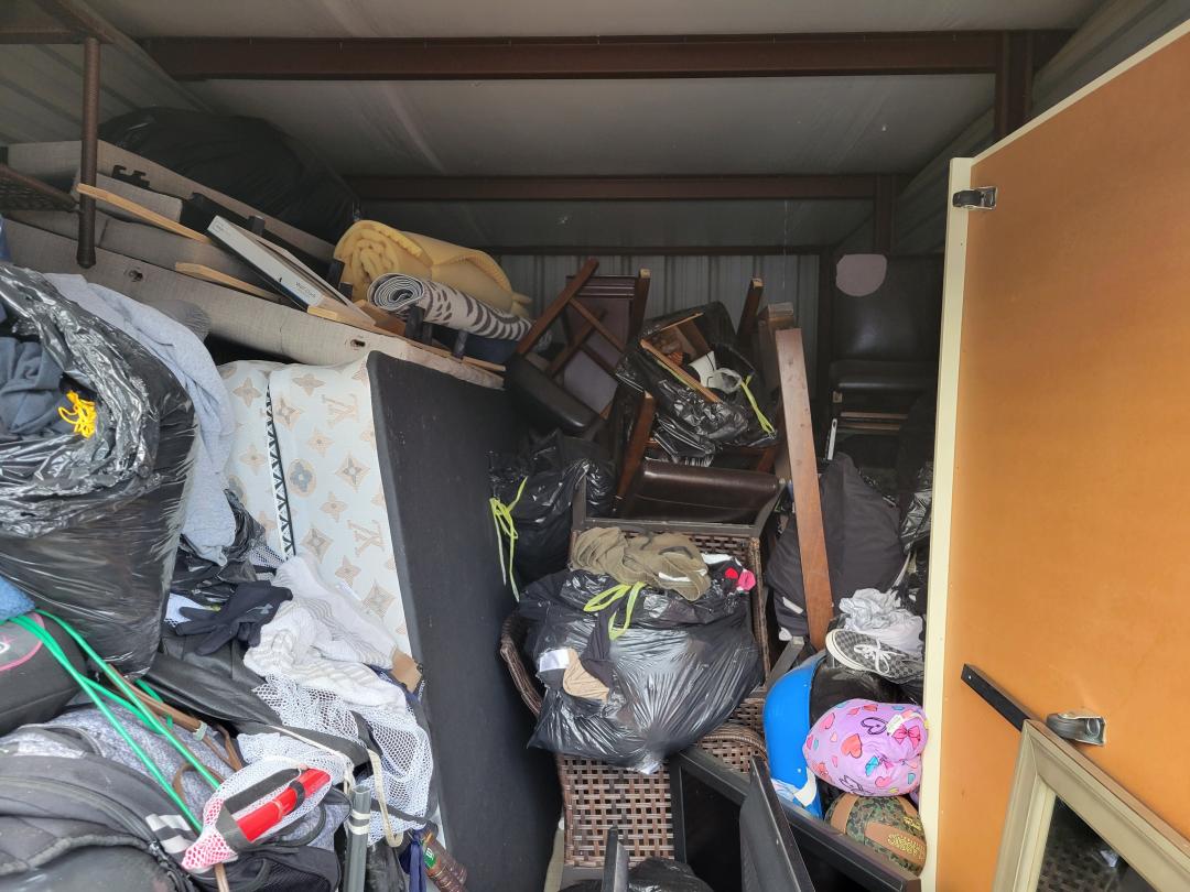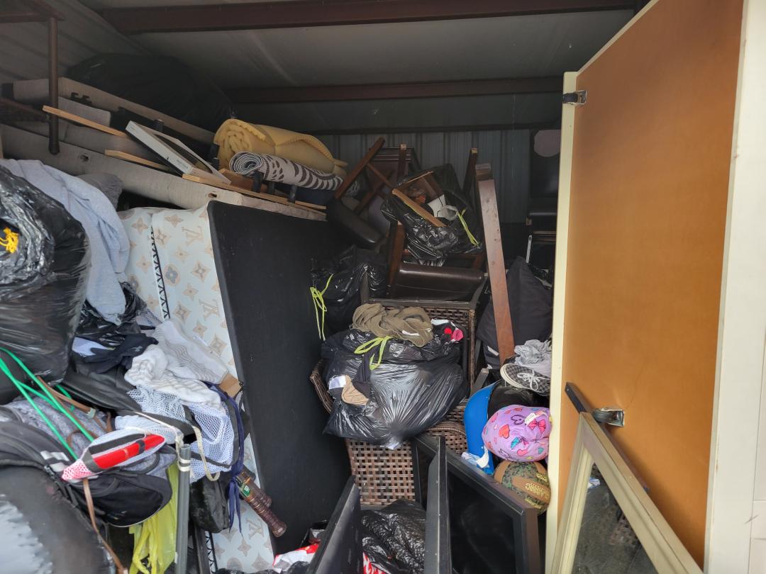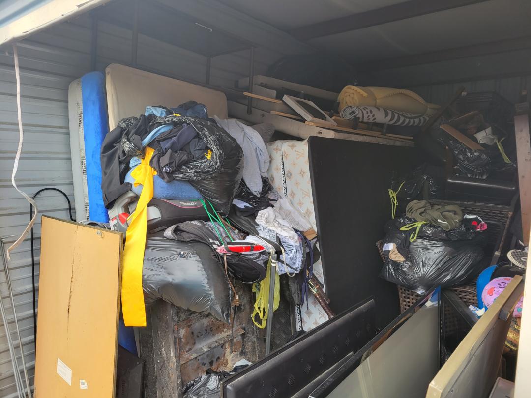 This unit appears to contain…TV, mattress, box springs, bed frames, chairs, plastic bags, plastic containers, misc boxes, misc items