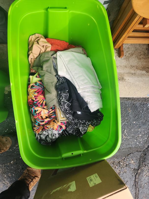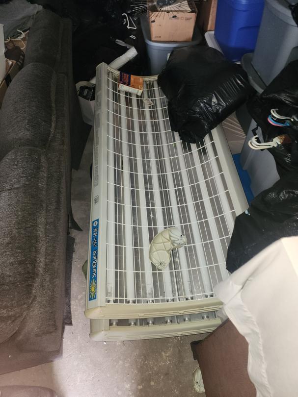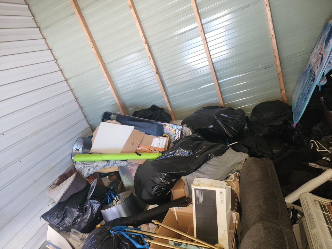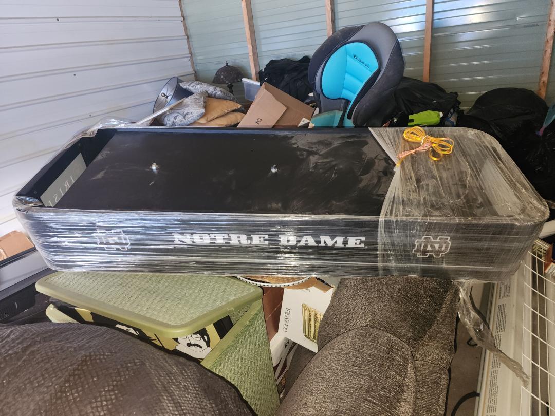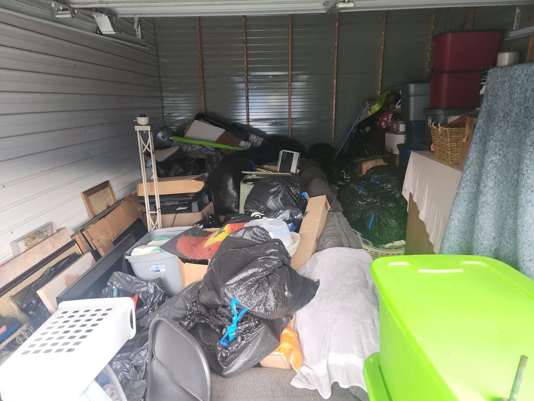 This unit appears to contain…Large amounts of women's assorted clothing Couch Broken china glass cabinet Golf clubs Coleman's portable grill Fishing poles Tanning bed Vizio 40-in flat screen and 32 inch Assorted paintings Refrigerator and washer and dryer Like new Notre Dame pool table light Vacuum and assorted lamps