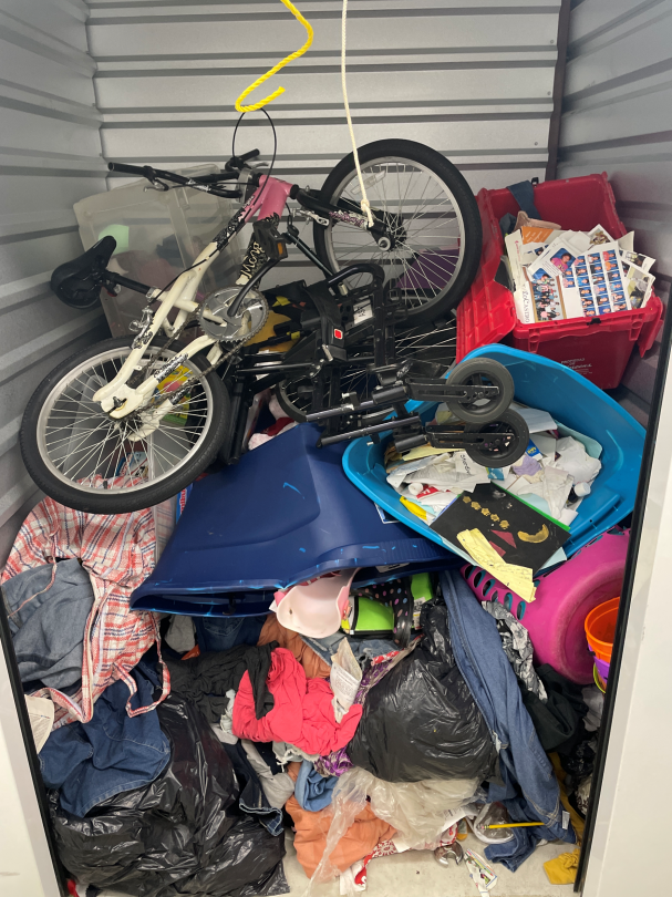 This unit appears to contain…bike, clothes, totes, bags, laundry baskets, wheelchair