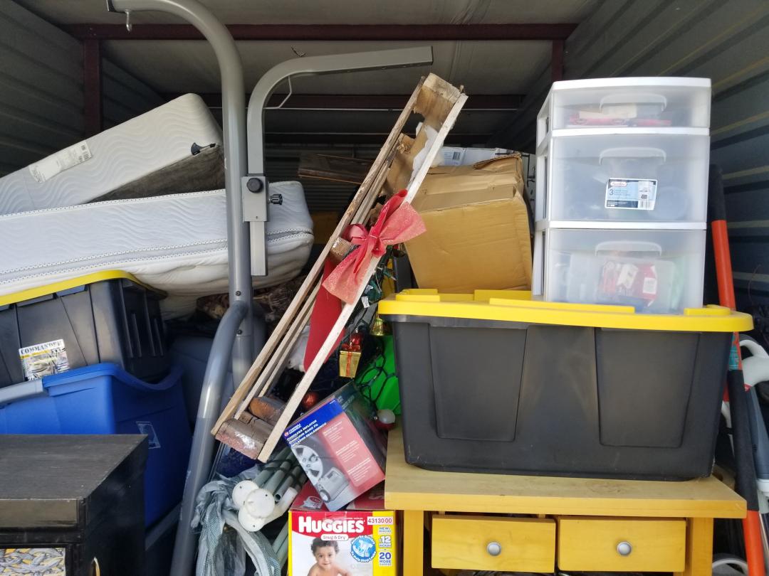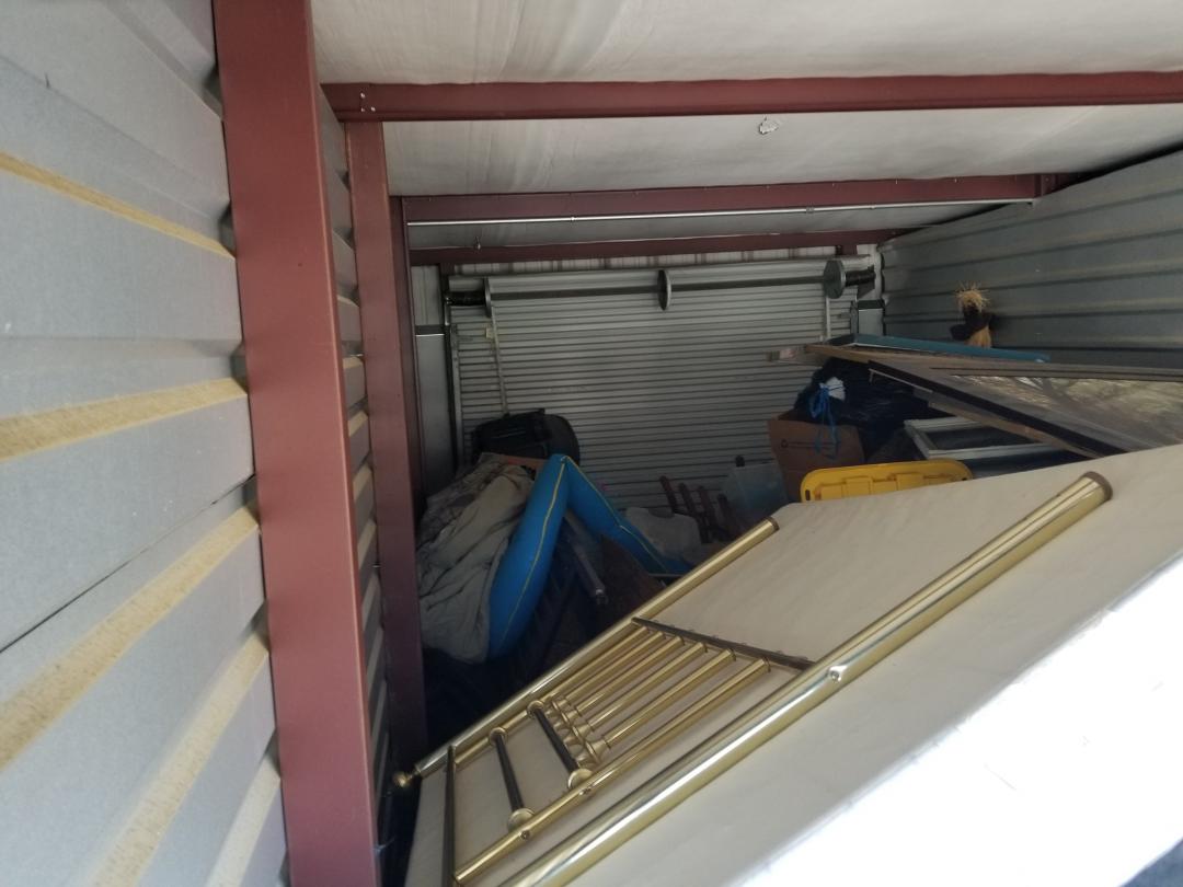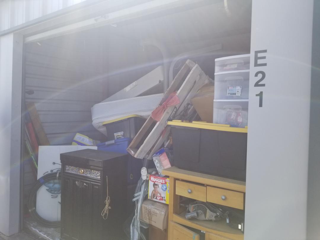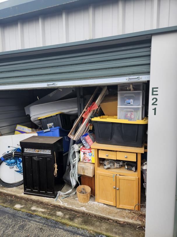 This unit appears to contain…Non climate controlled unit with various items including tools, furniture, end tables, totes, plastic dresser, a large painting, and vacuum cleaner.