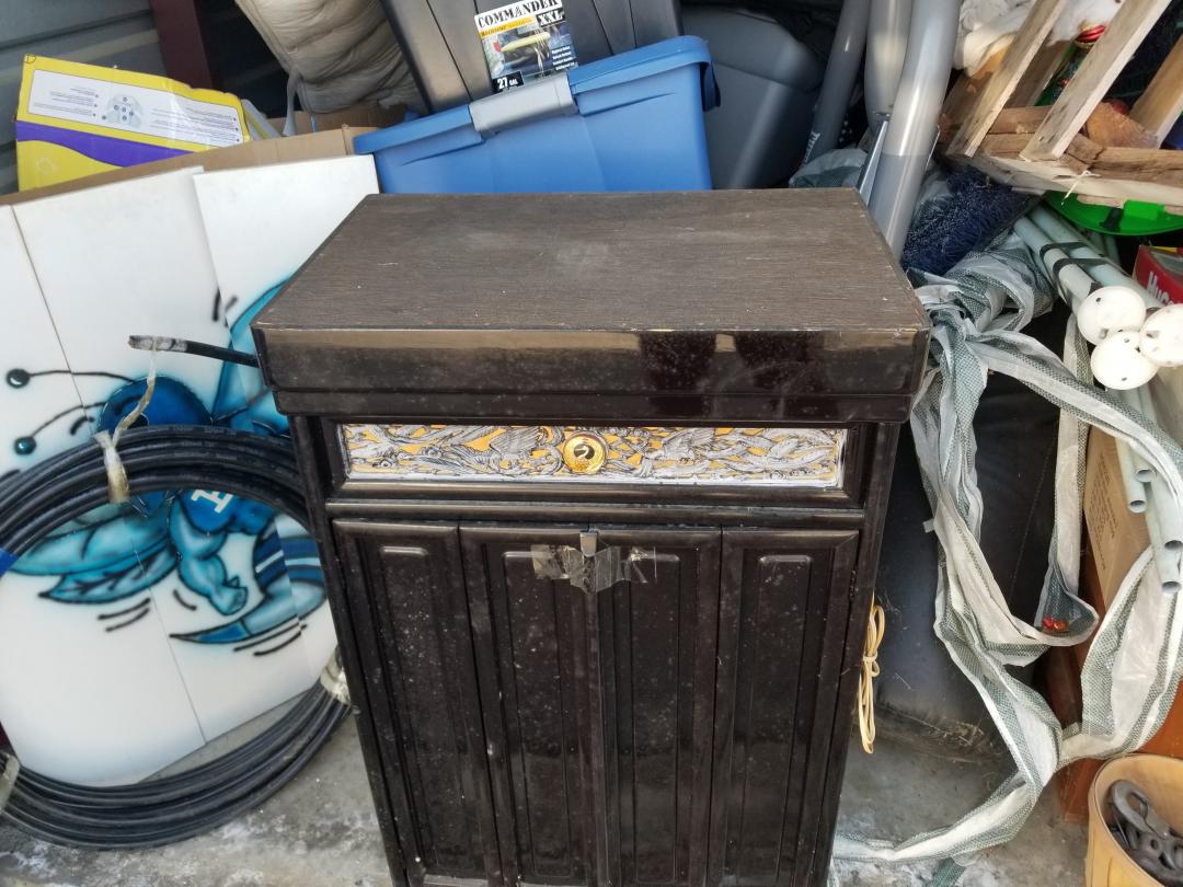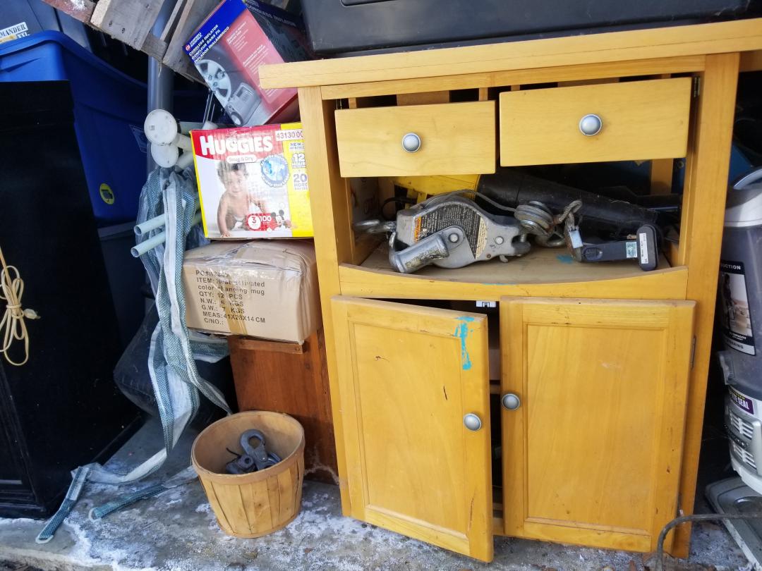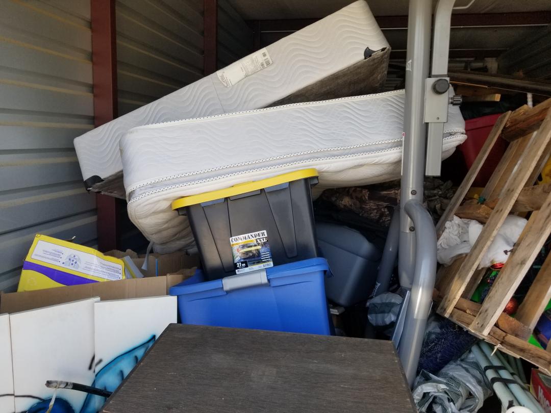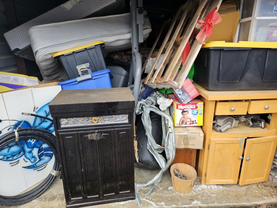 This unit appears to contain…Non climate controlled unit with various items including tools, furniture, end tables, totes, plastic dresser, a large painting, and vacuum cleaner.
