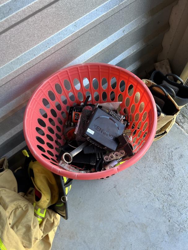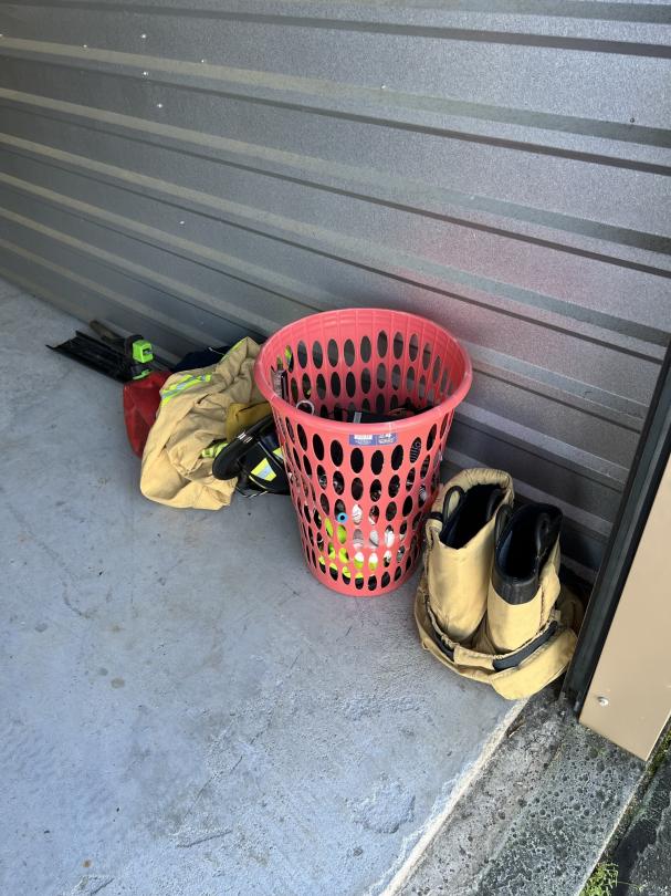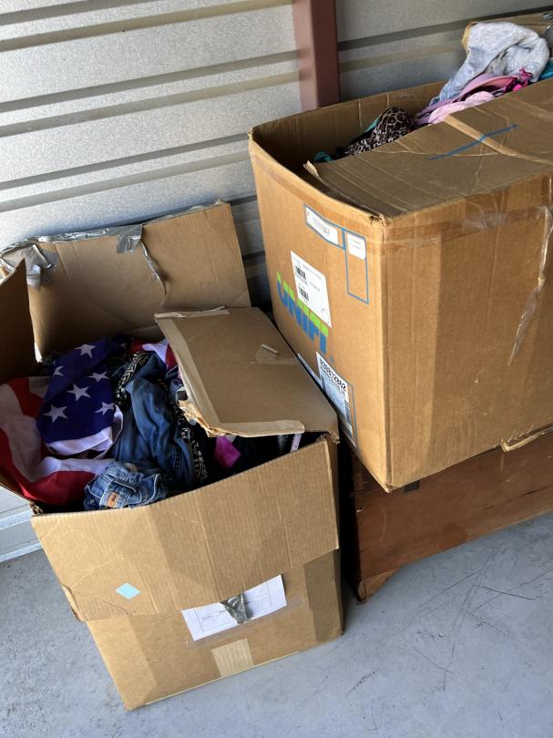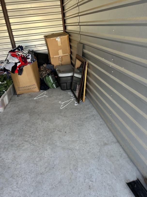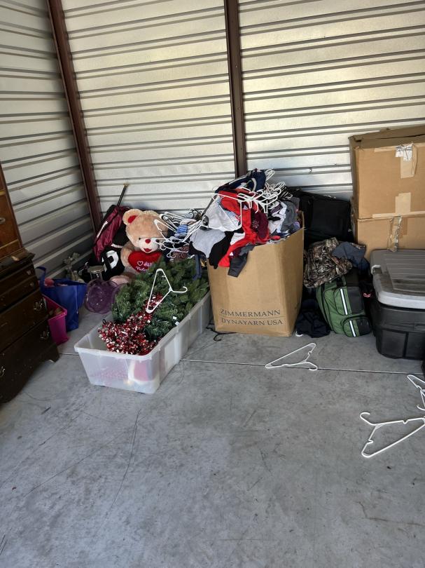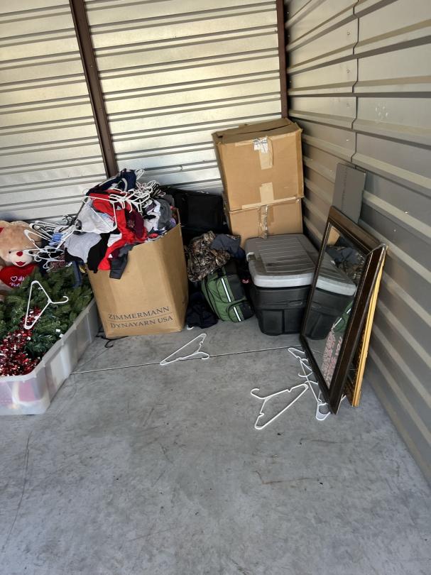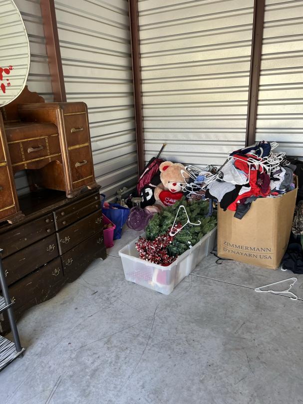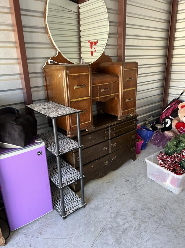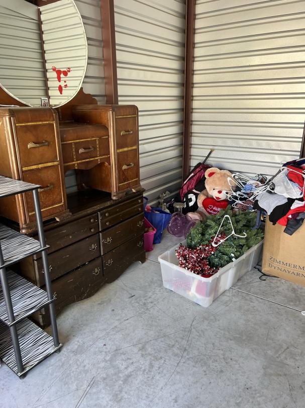 This unit appears to contain…firefighter gear, mirrors, dresser, vanity, softball bat bag and bat, car radio, hunting items, clothes, decor, chest, christmas tree/decor, shelf, mini fridge,