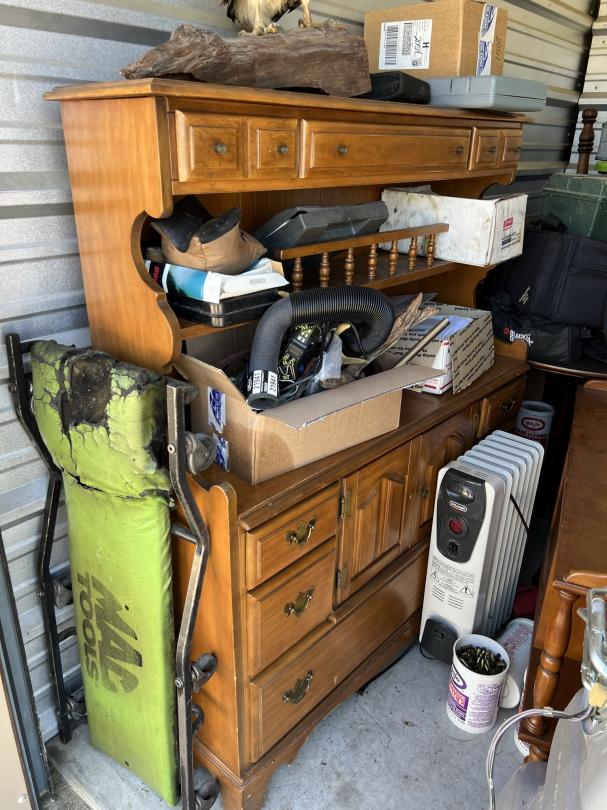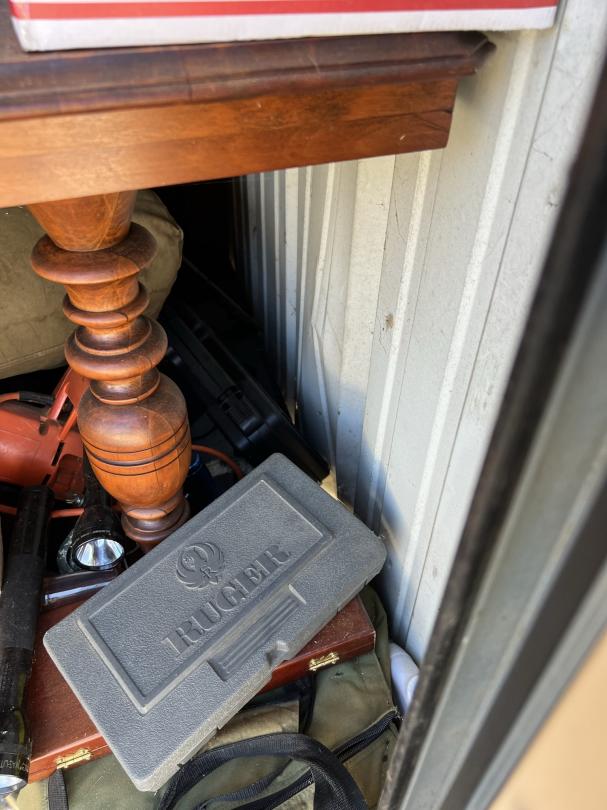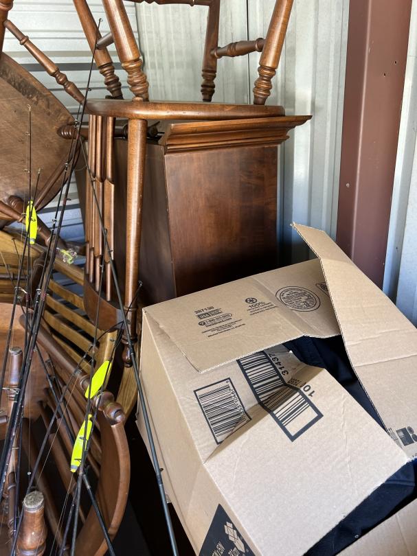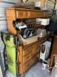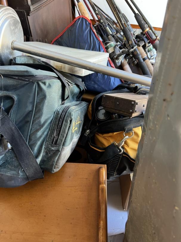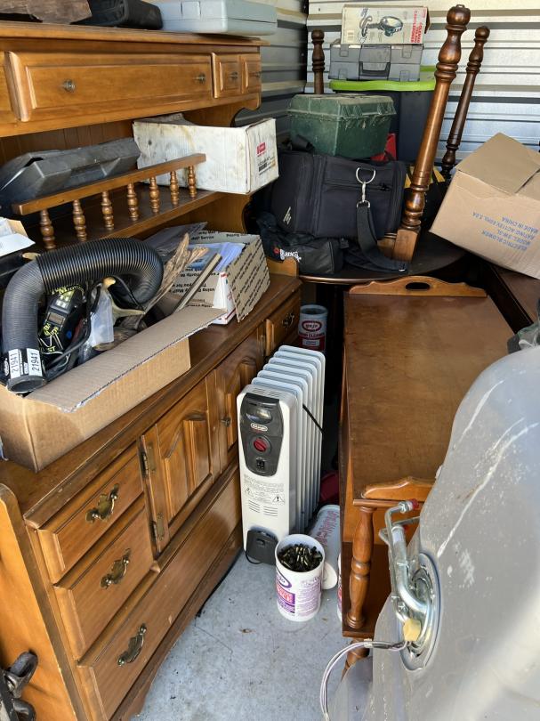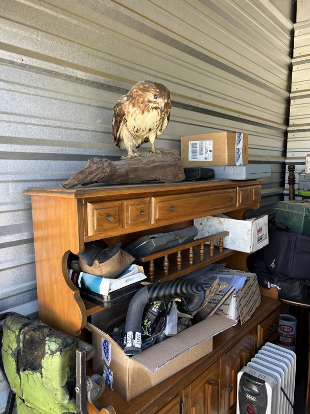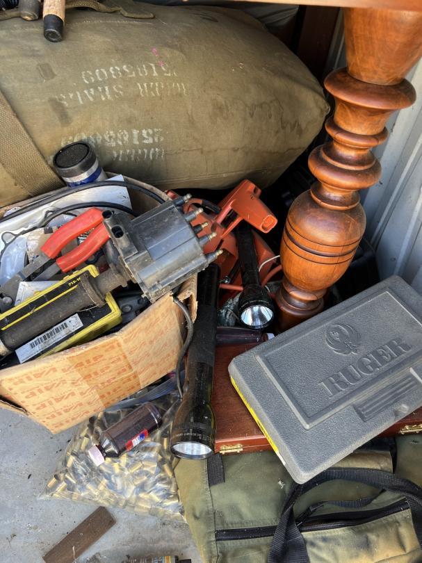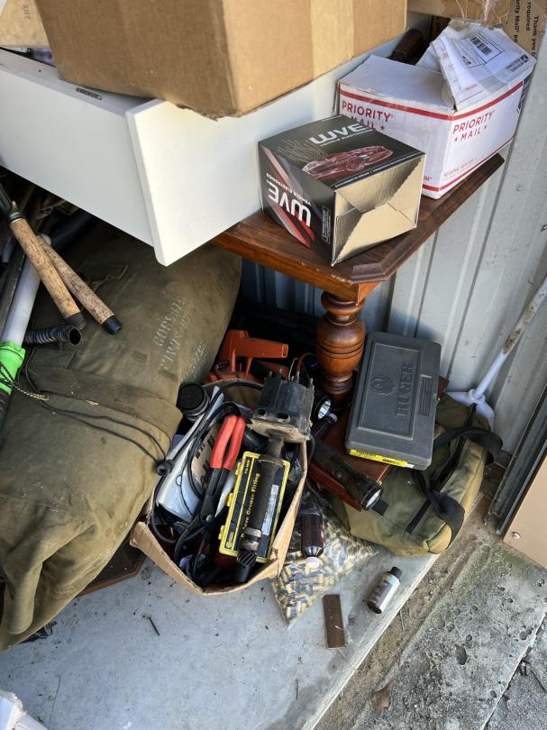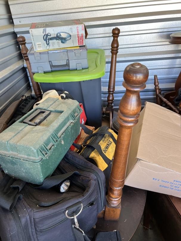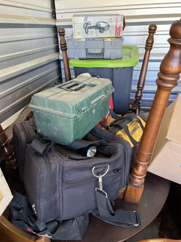 This unit appears to contain…stuffed hawk, creeper, fishing poles, flashlights, gunshell casings, gun cases, furniture, dresser, tackle box, fuel tank, tools, table and chairs, rocking chair, old marble top table, saw, heater. old lamp