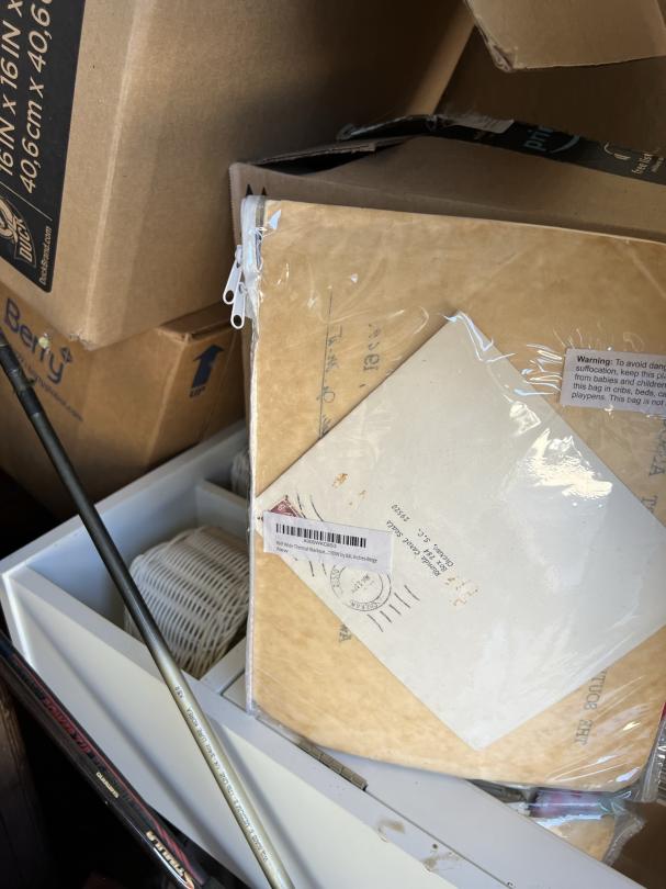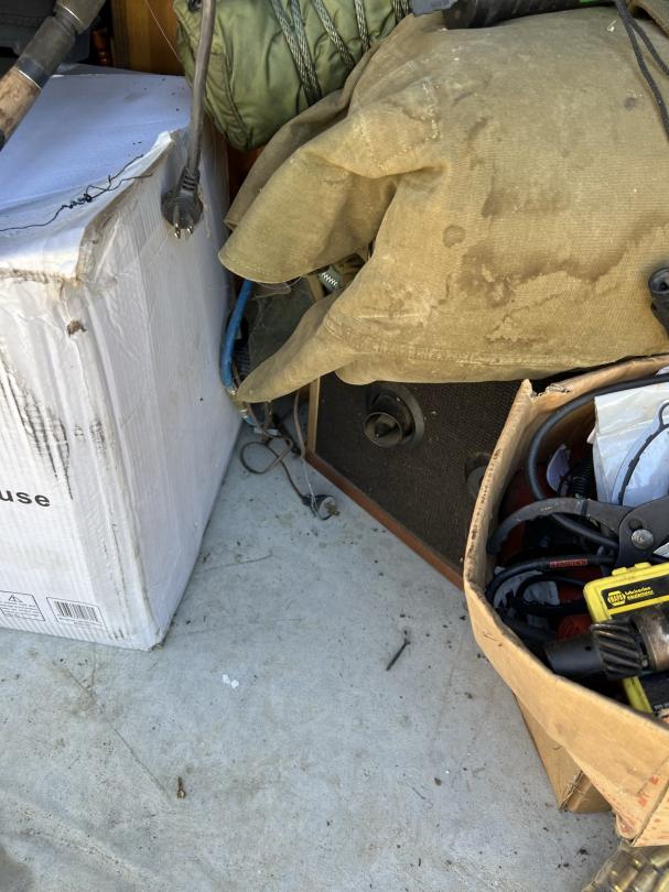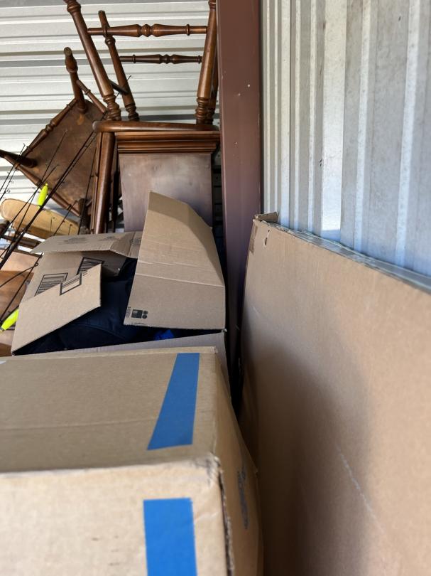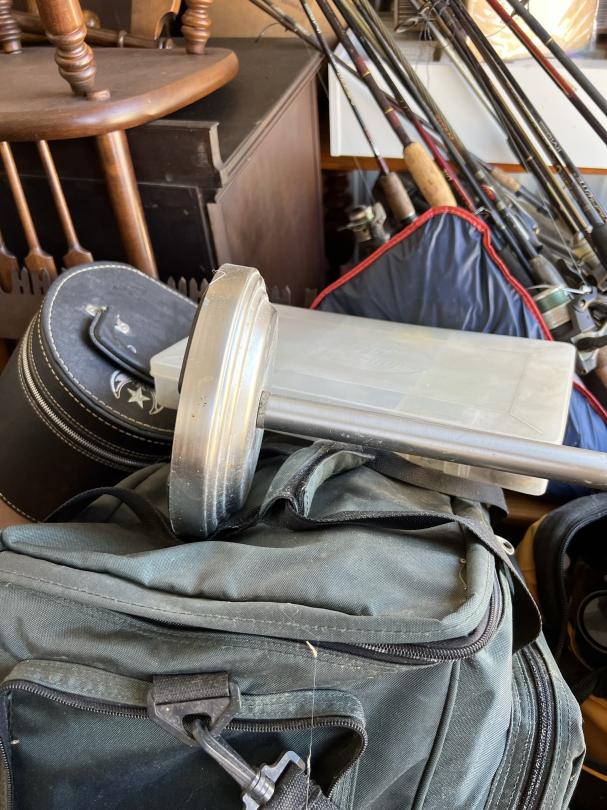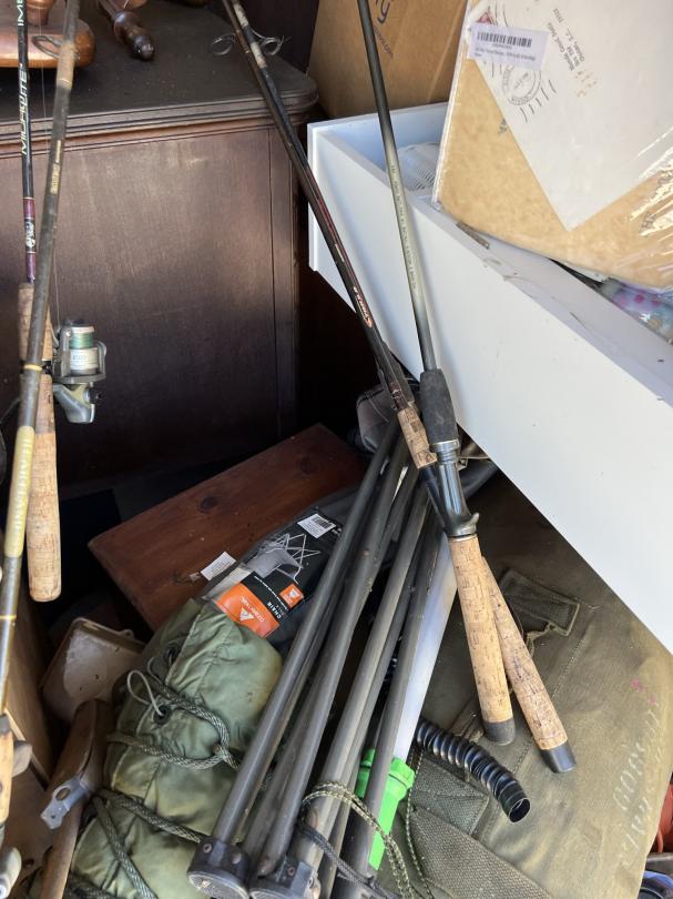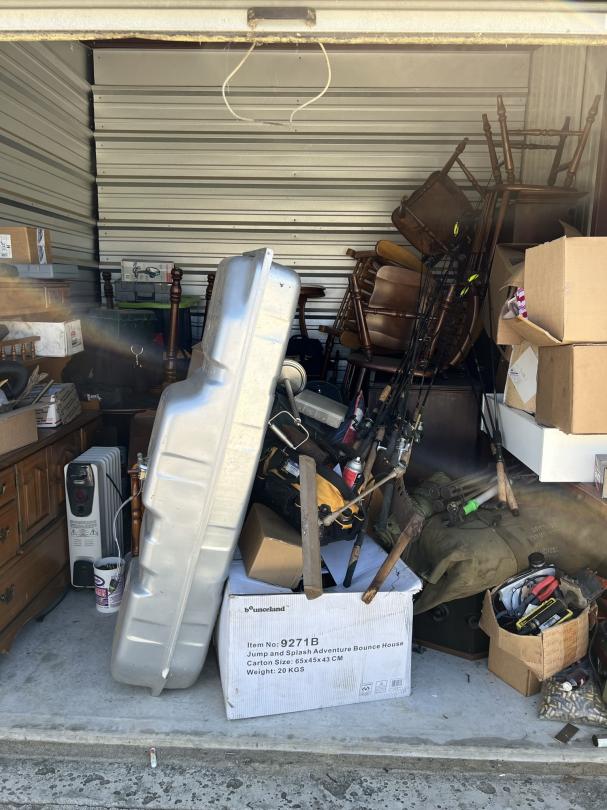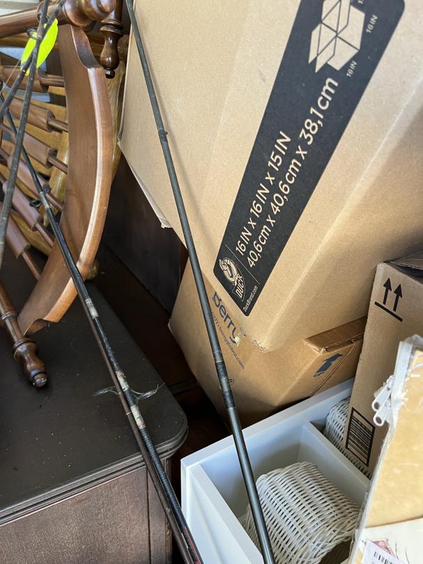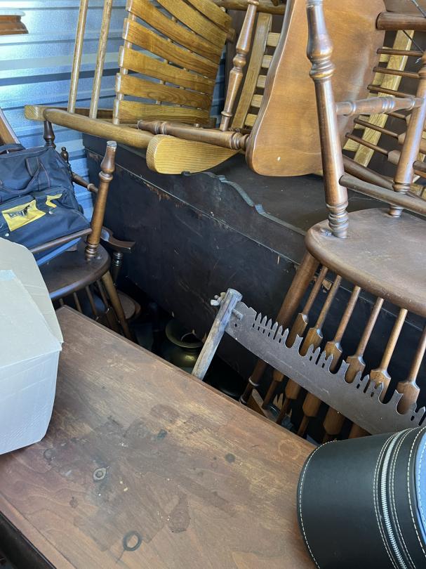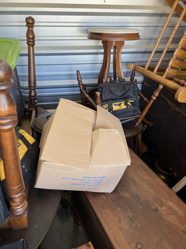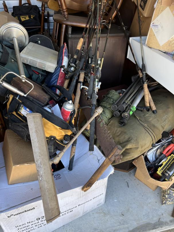 This unit appears to contain…stuffed hawk, creeper, fishing poles, flashlights, gunshell casings, gun cases, furniture, dresser, tackle box, fuel tank, tools, table and chairs, rocking chair, old marble top table, saw, heater. old lamp