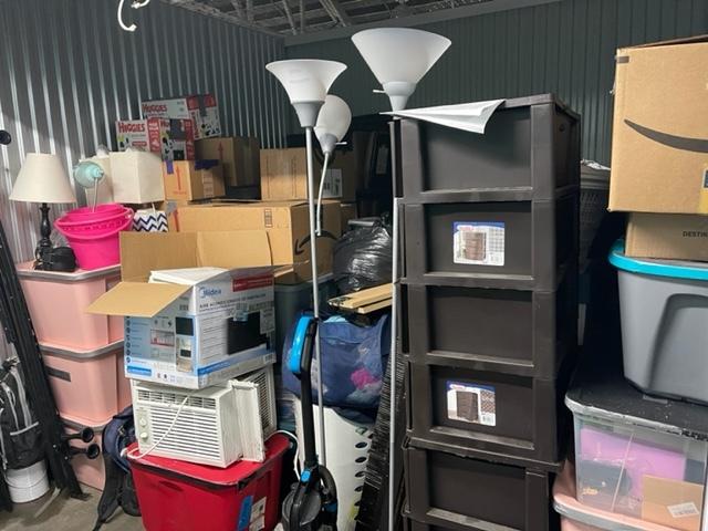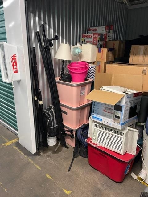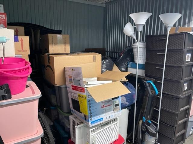 This unit appears to contain…totes, bed frame, AC units, bags, boxes, table, lamp