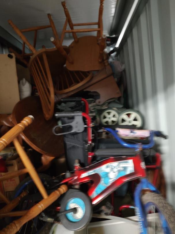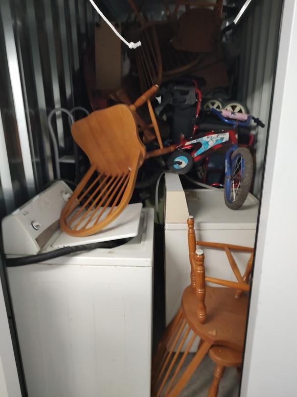This unit appears to contain…This unit appears to contain: bikes, washing machine, dryer, chairs, table, baby furniture, miscellaneous items,