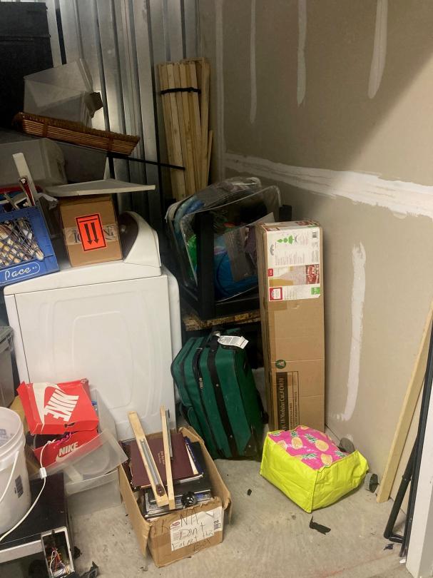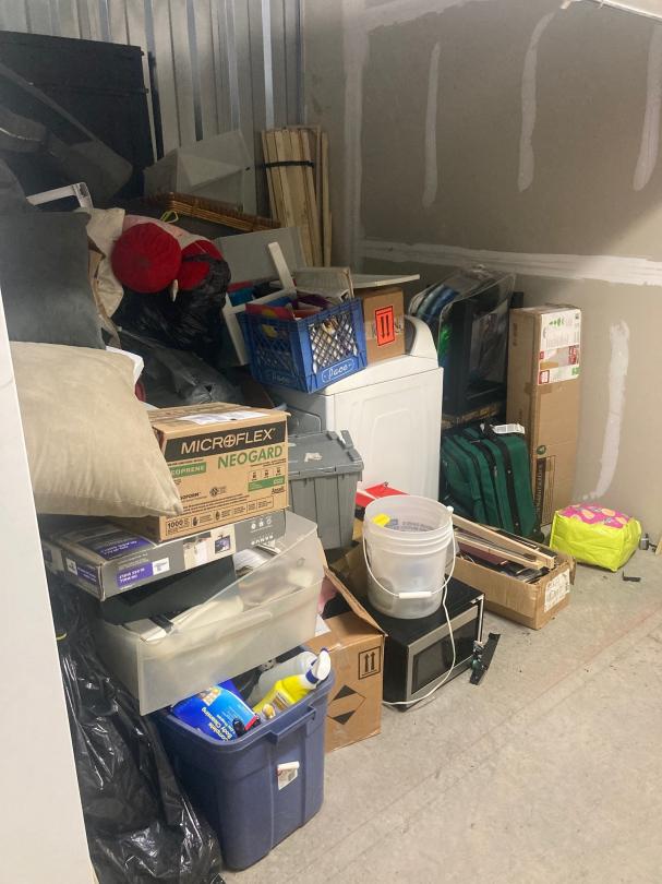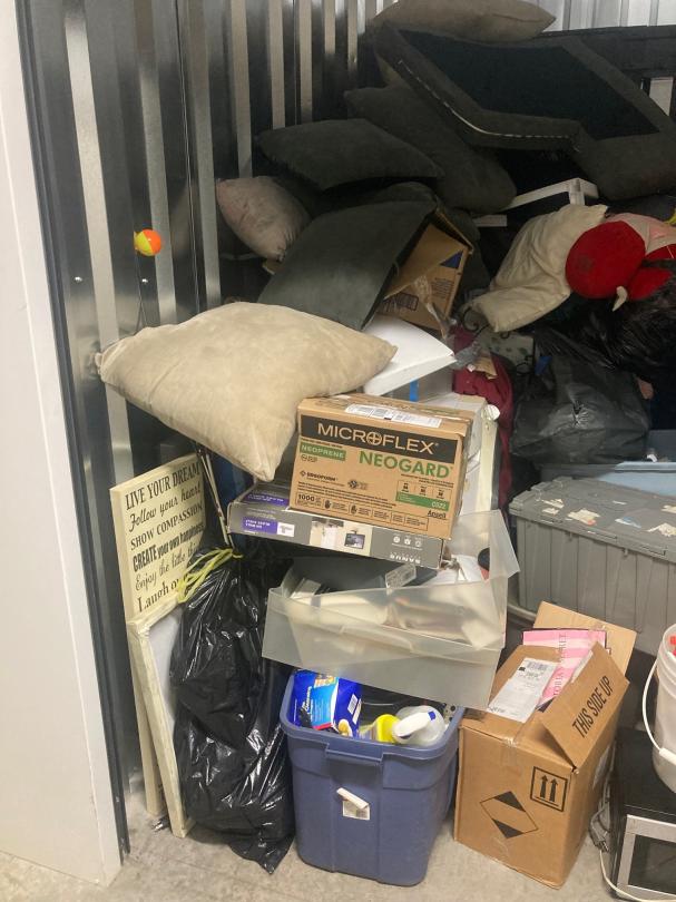 This unit appears to contain…Washer and Dryer Boxes Bags Plastic Totes Microwave Buckets Pillows Various Items
