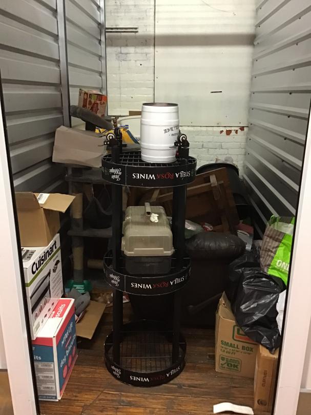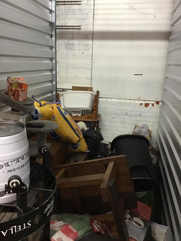 This unit appears to contain…5x10x13 Interior 3rd Floor Street Level Heated, this unit appears to have a rolling wire rack shelf, furniture, cat tower, and other household goods
