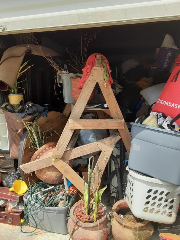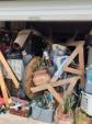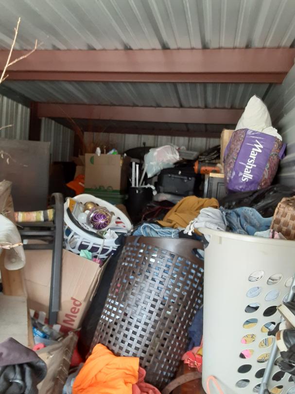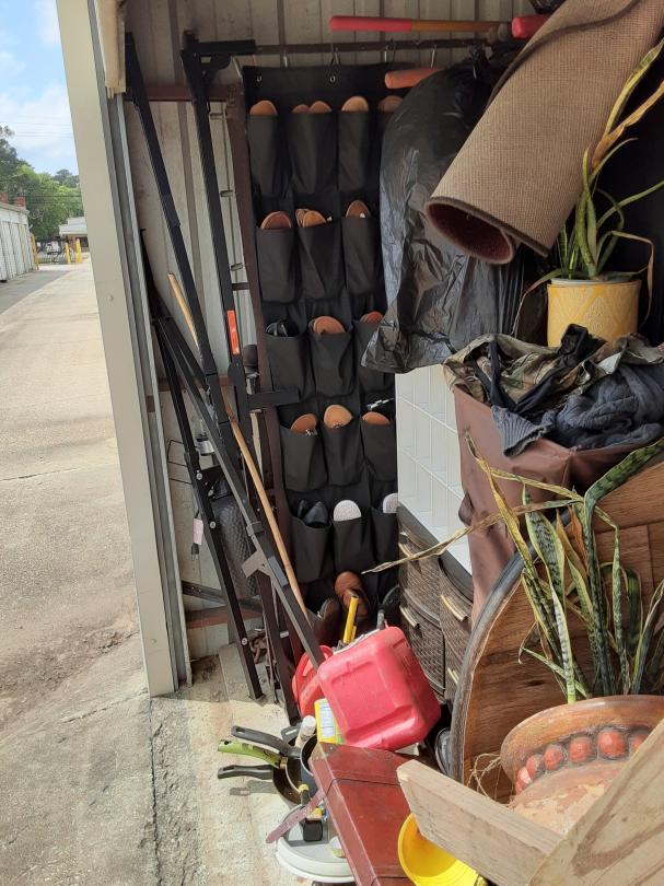 This unit appears to contain…Clothes, Shoes, pot plants, bins, boxes, Sawhorses Tables and chairs Cabinet , Tools