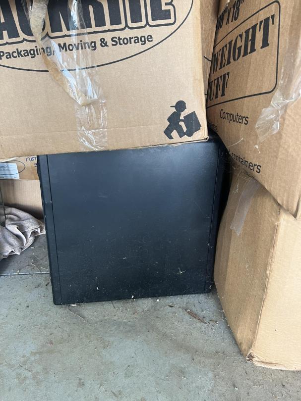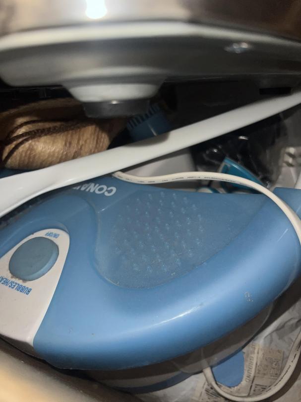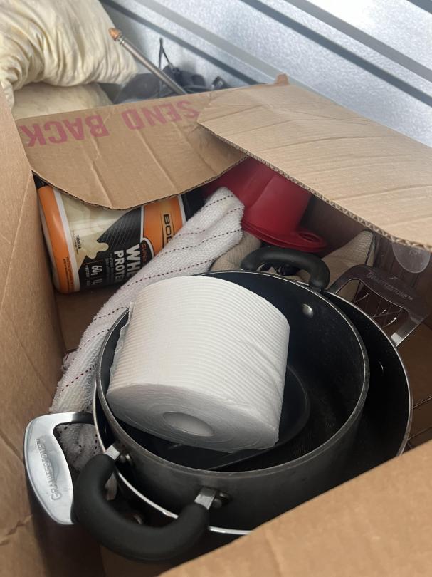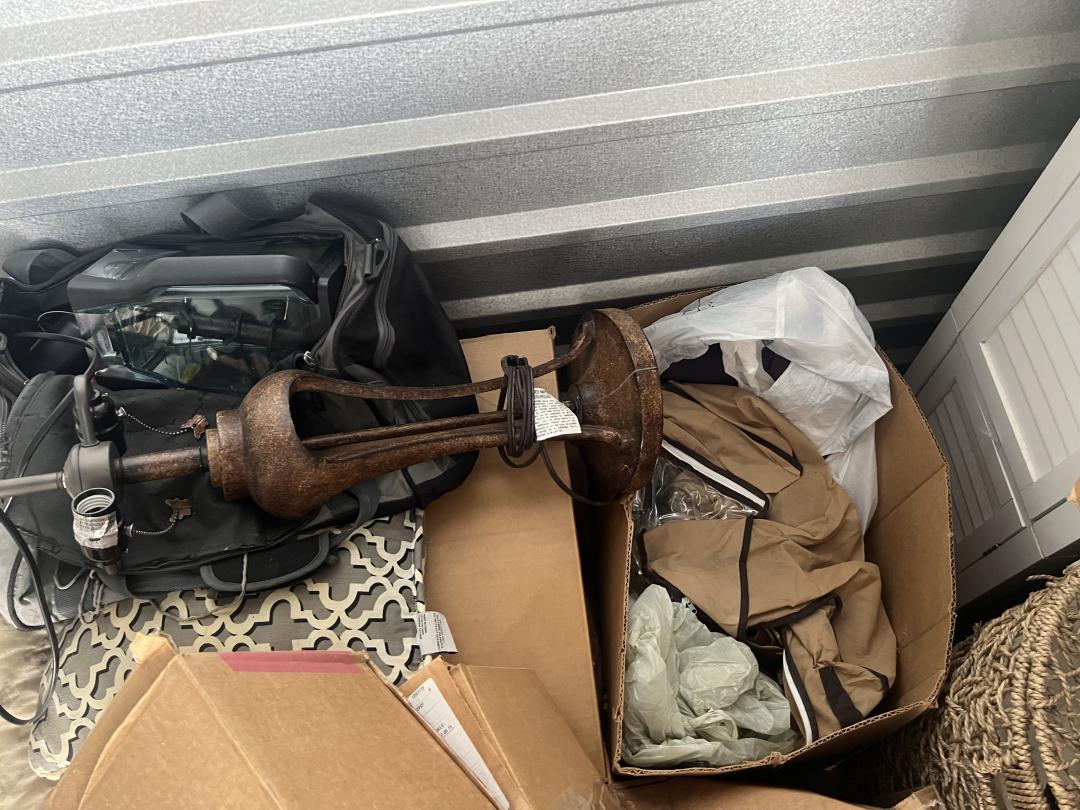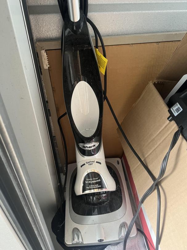 This unit appears to contain…Pots, Pans, Kitchen Utensils, Foot Spa(Conair), Small Safe, Small Lamp, Boxes, Cabinet, Ninja Air fryer, Shark Sonic Duo Vacuum/Mop, Shark Vacuum.
