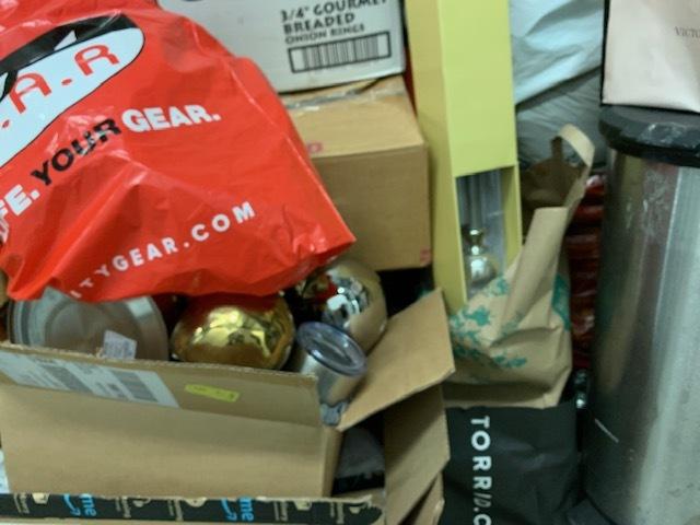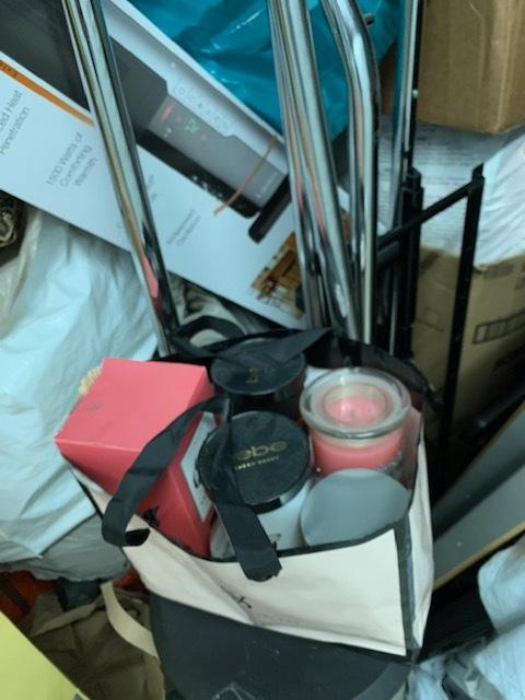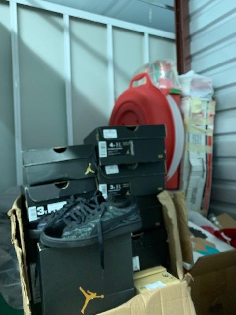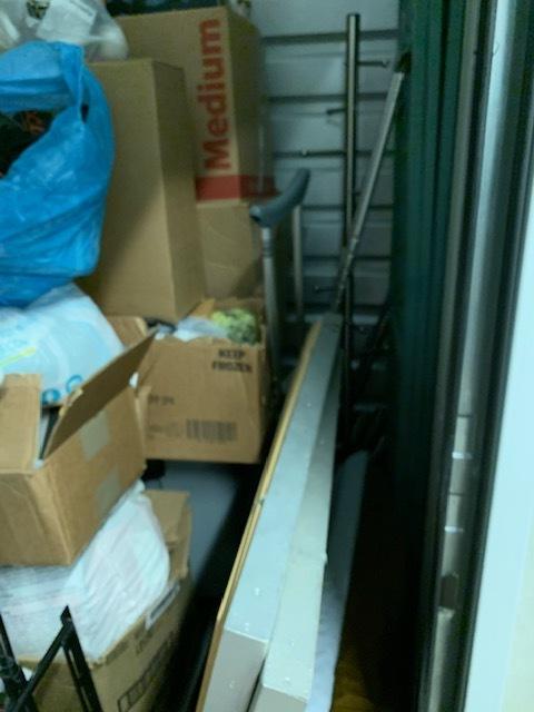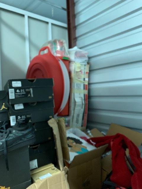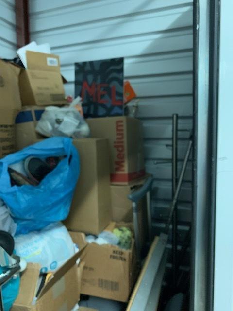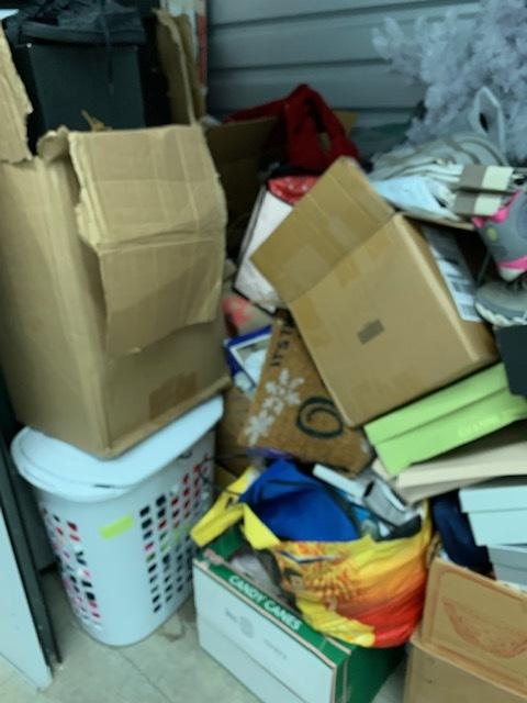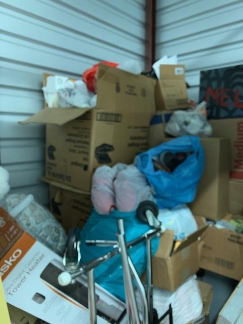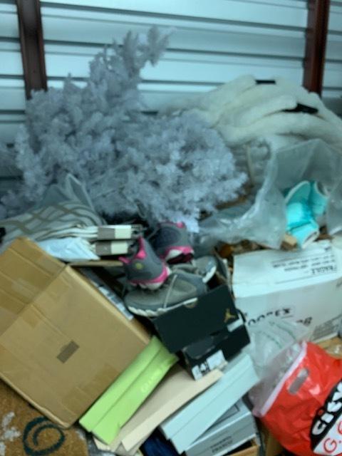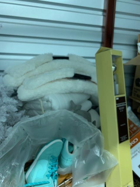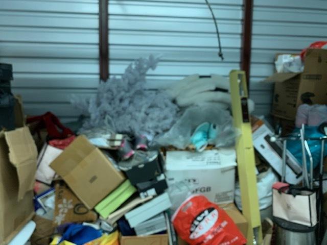 This unit appears to contain…Climate Controlled Upper Floor, ceramic tower heater, Christmas tree, Christmas , wall art, candles, Flat screen tv's, comforter sets, rolling clothes rack boxes