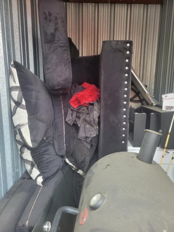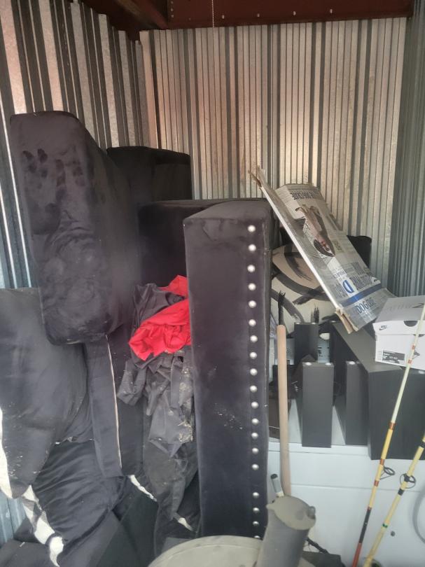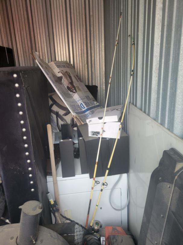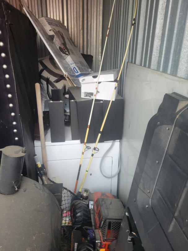 This unit appears to contain…dryer,tv,smoker,couch,pillows,decor,misc items, misc boxes,toys
