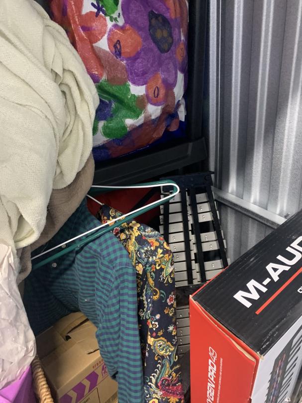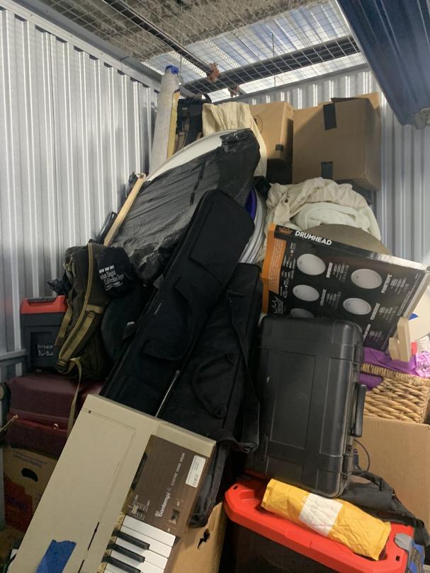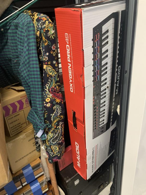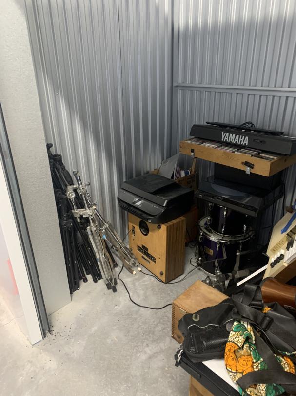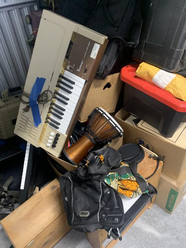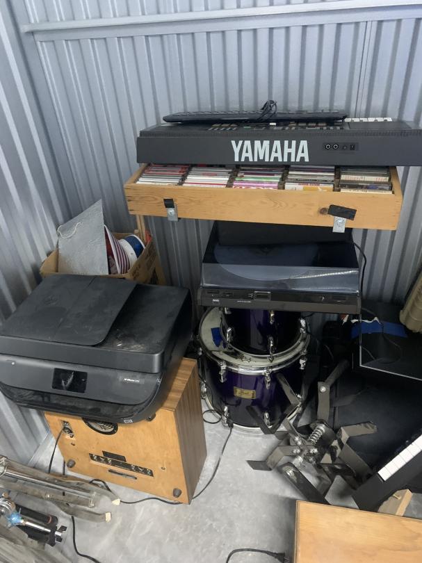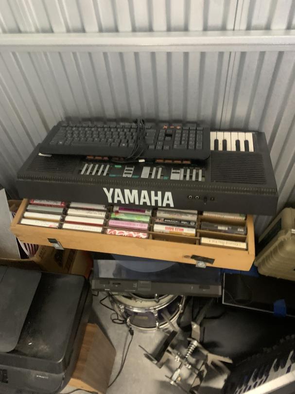 This unit appears to contain…Cassette tapes, drums, printer, keyboards, instrument stands, suitcases, Amps/speakers, cassette holders, shelves, clothes