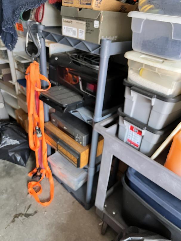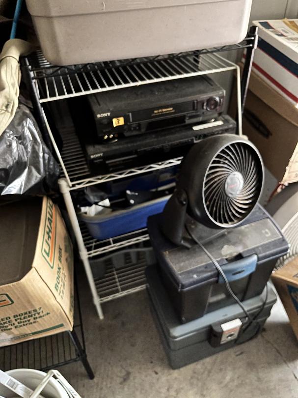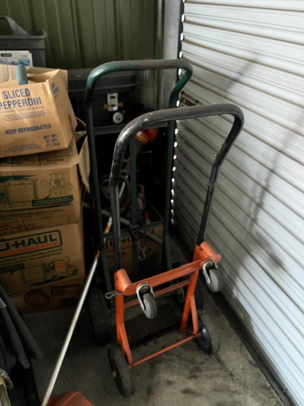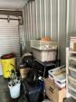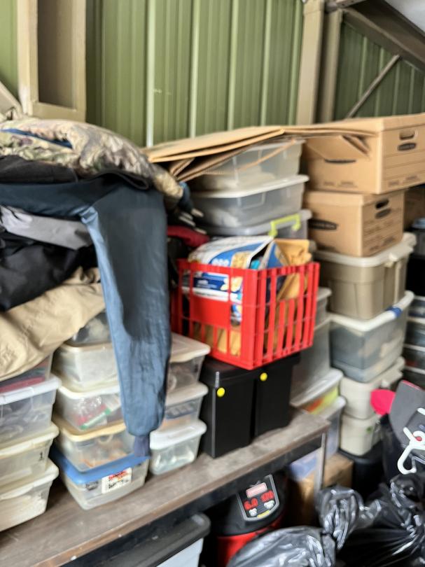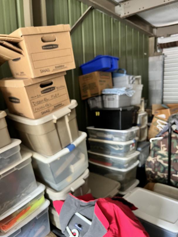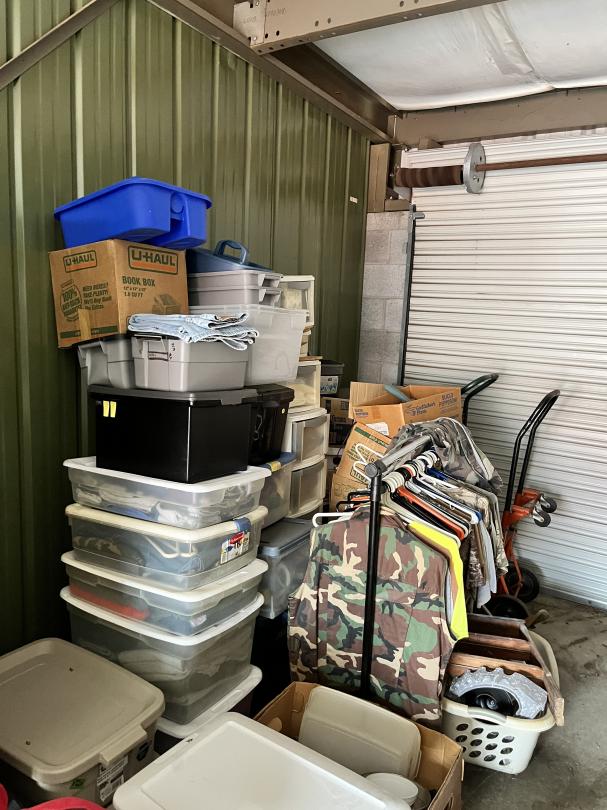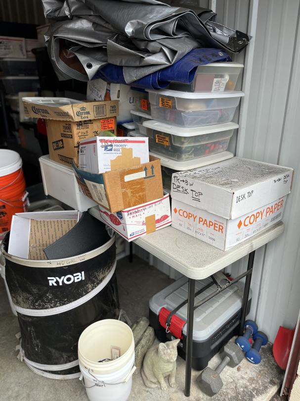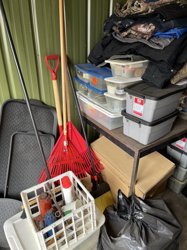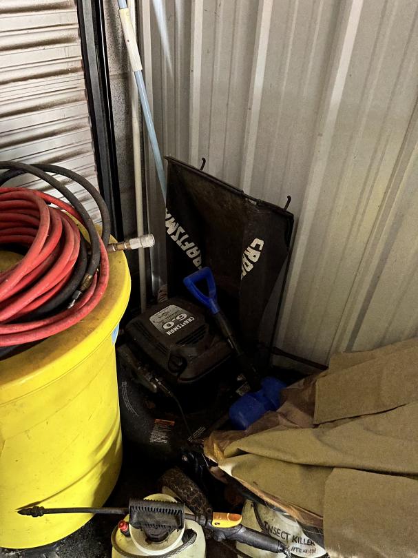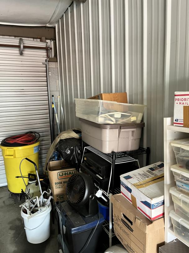 This unit appears to contain…Large 2 door unit - Organized Several stocked and stacked boxes, multiple totes and containers, work benches, work tables, storage bins, cabinets, shelving units, tie downs, rachet straps, empty gas cans, buckets, extension cords, hand tools, flashlights, dollies, weed eater, lawn mower, leaf blower, hand jacks, tarps, rakes, clothing, mats, blankets, fans, electronic equipment, auto parts, air hoses, sprayer, industrial size containers on wheels. etc.