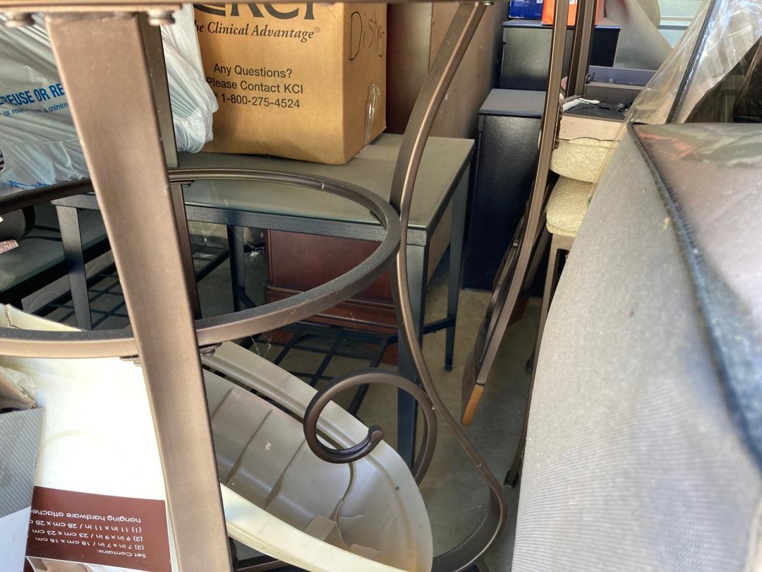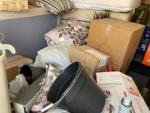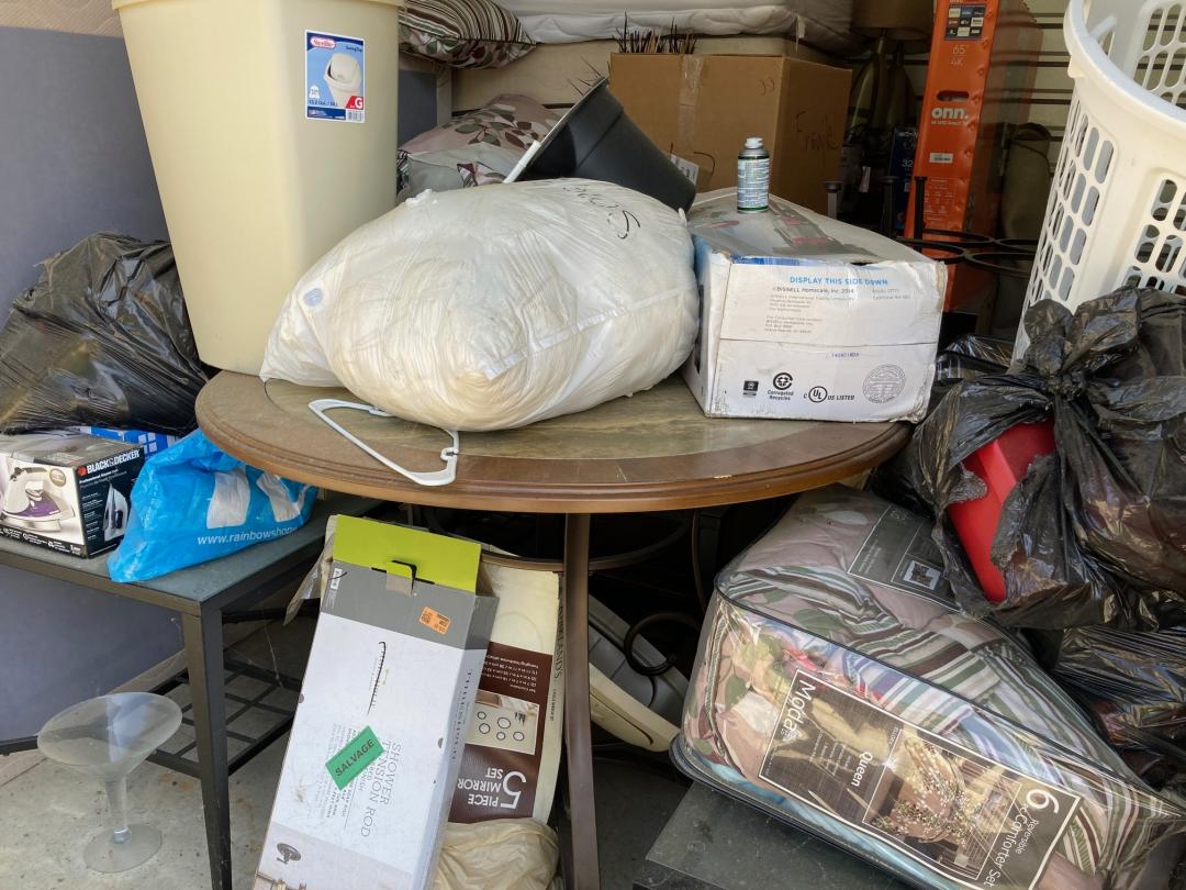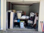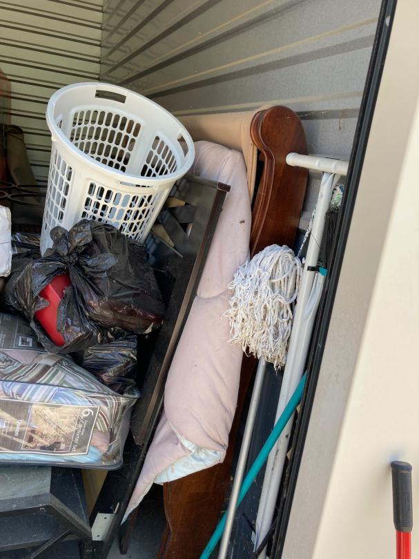 This unit appears to contain…Drive-Up Storage - King & Queen Mattress, table & chairs, 2 headboards, TV, dresser, lamps, end table, TV stand, pillows, ironing board, iron, boxes, laundry basket, mop bucket