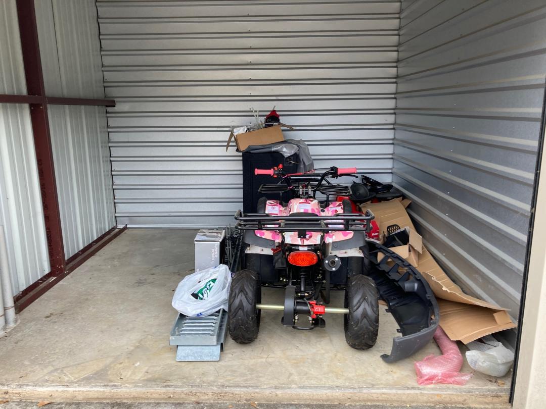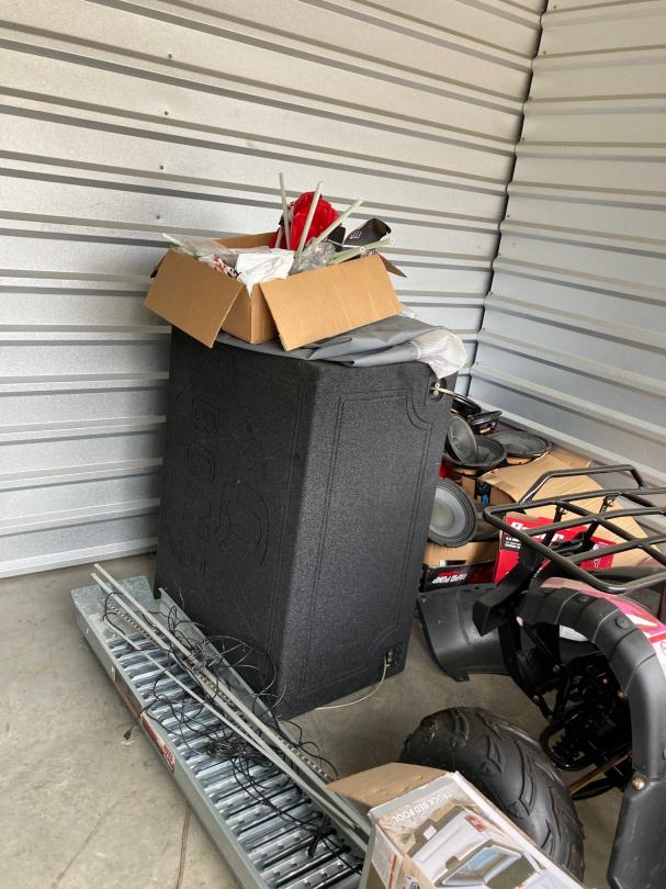 This unit appears to contain…Drive-Up Storage - 4 wheeler, speakers, exhaust pipes, rail ramps, speaker box, clothes, car bumper
