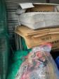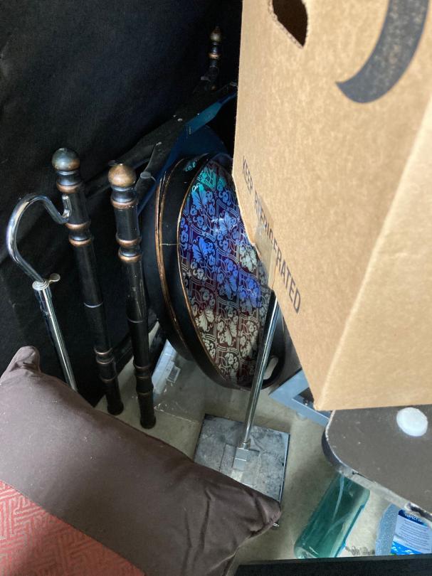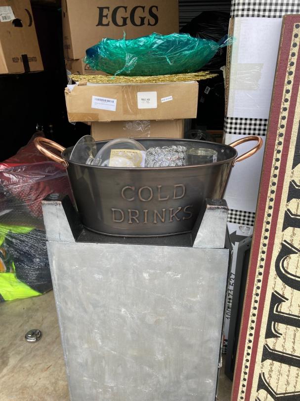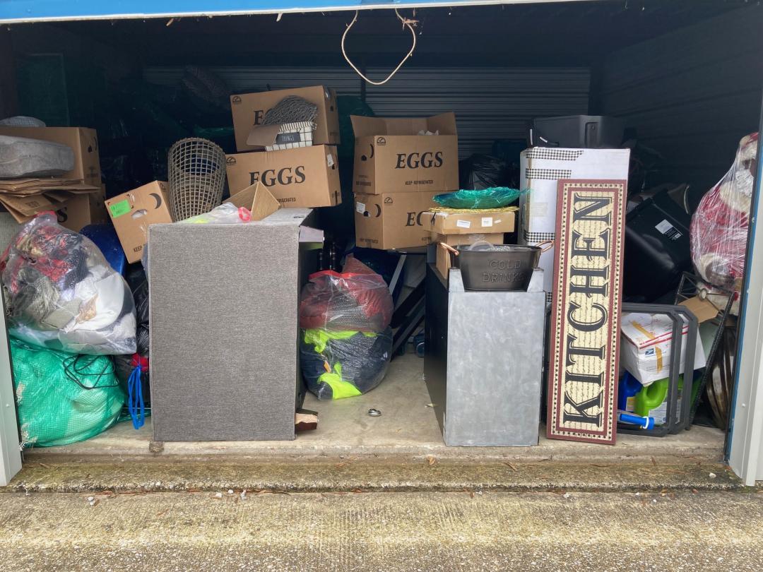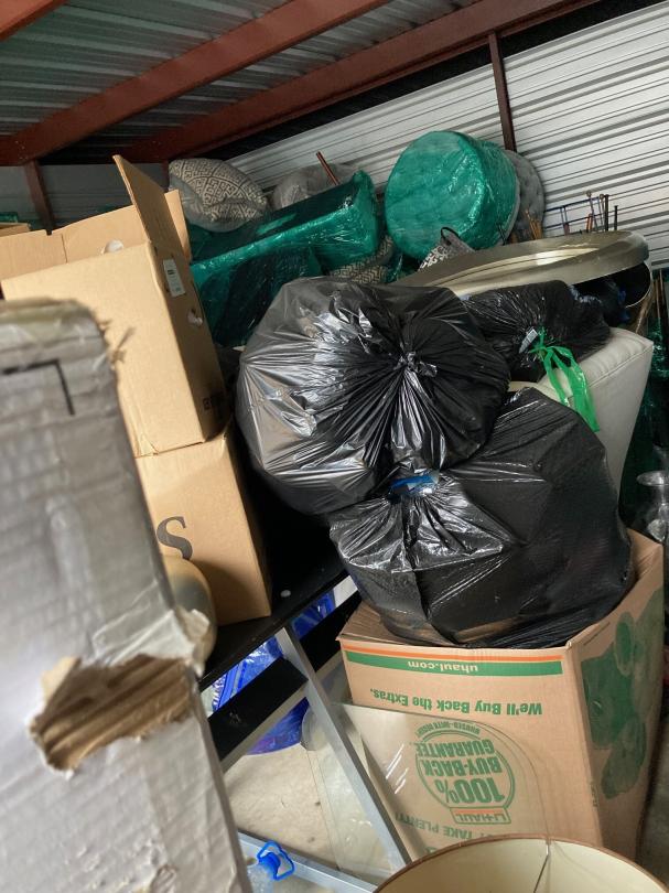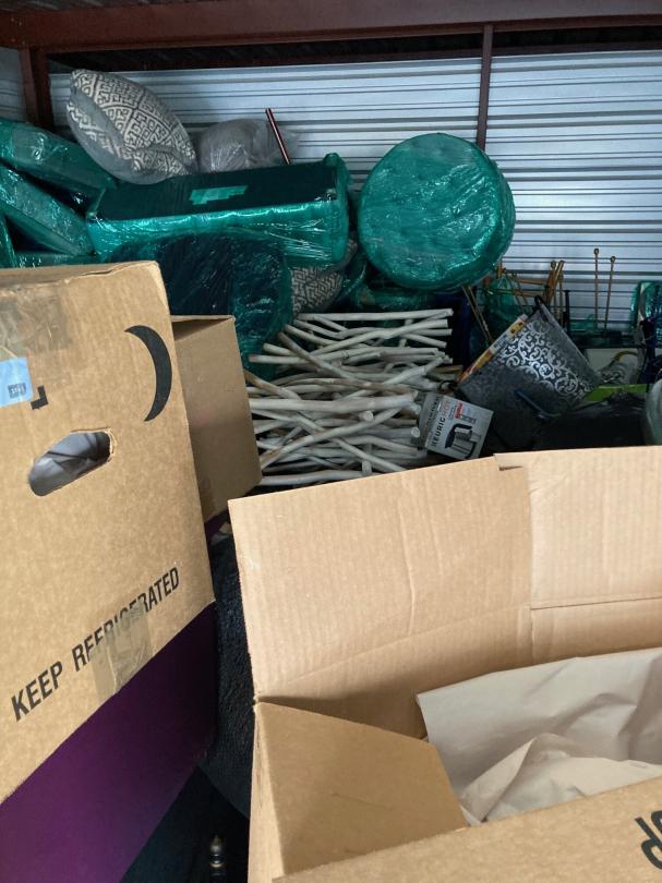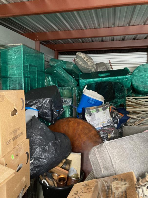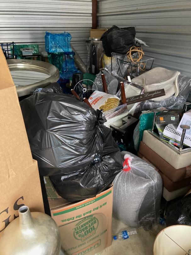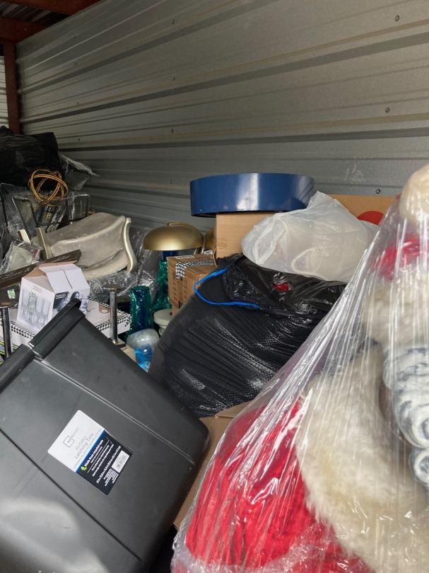 This unit appears to contain…drive up storage - mirror, couch, dresser, kitchen decorations, Santa statue, bucket, ottoman, dining chairs, pillows, table and chairs, misc bags & boxes, coffee table, end table