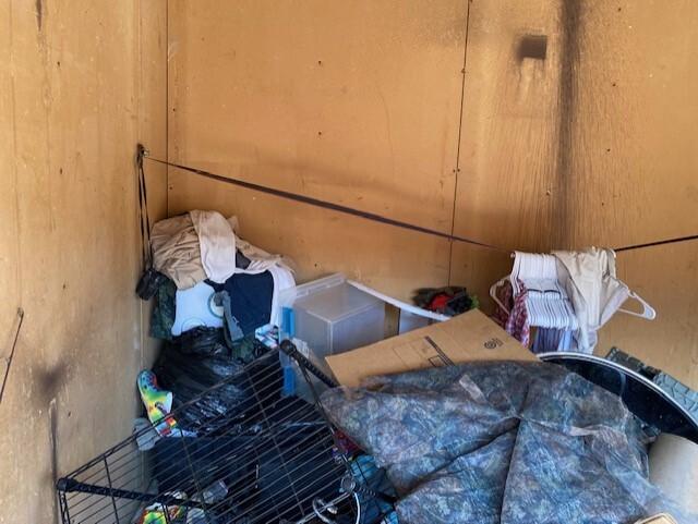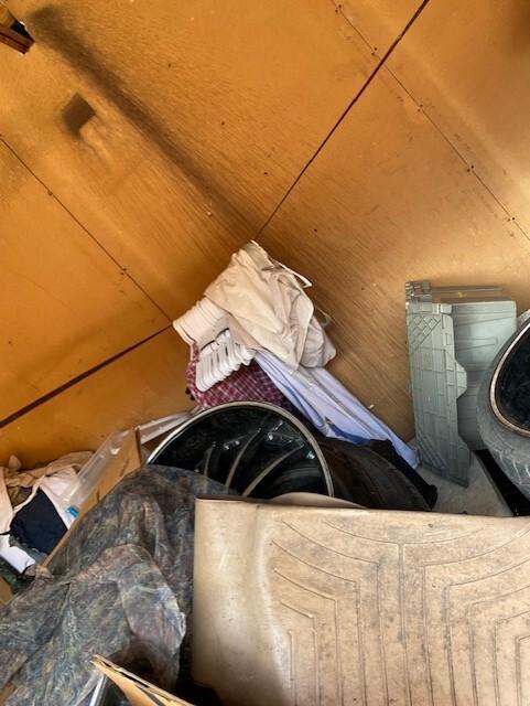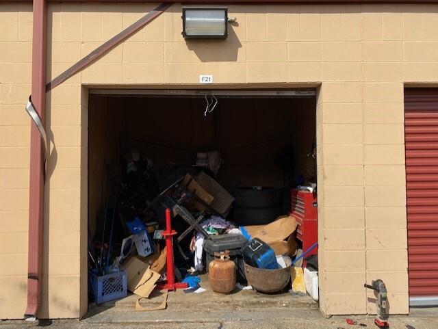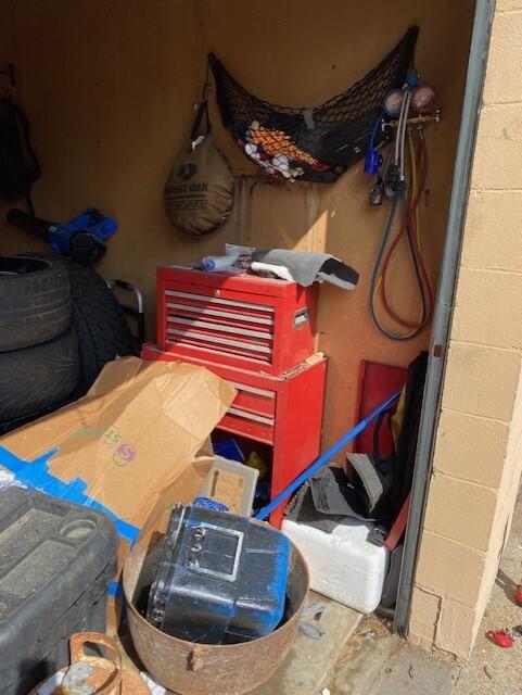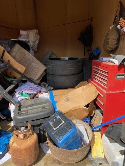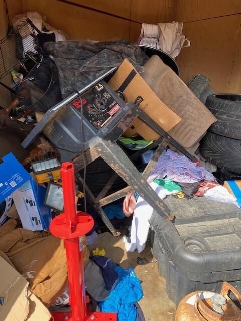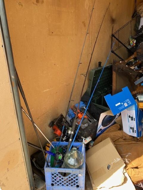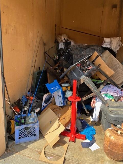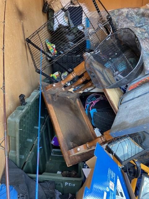 This unit appears to contain…This unit appears to contain fishing equipment, tools, shelving, lighting, tables, tarp, boxes, clothes