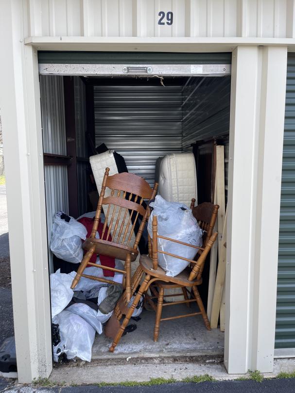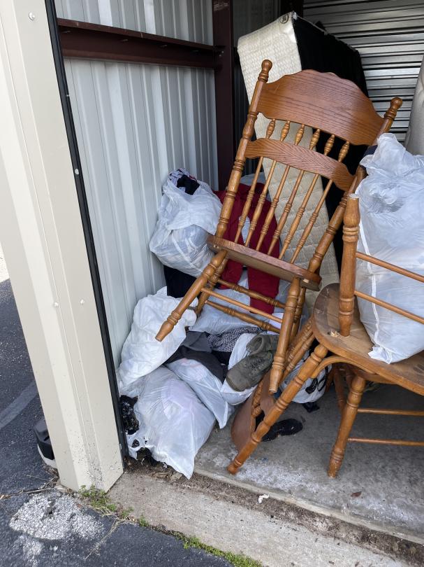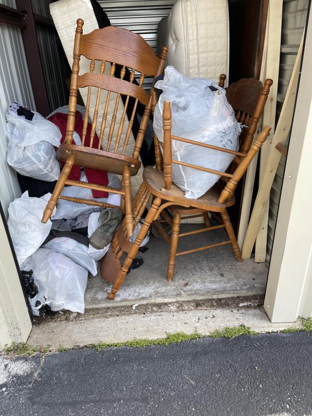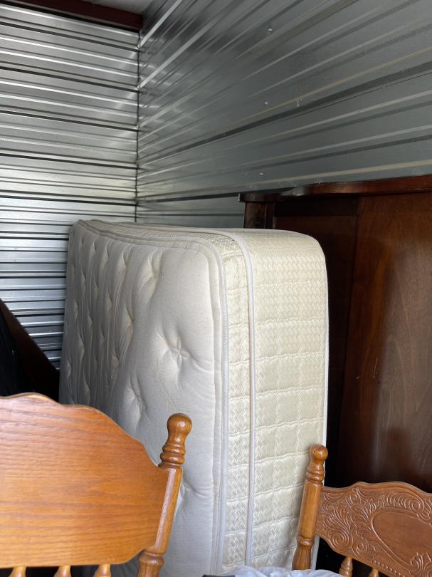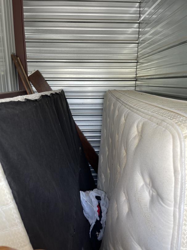 This unit appears to contain…Mattress, headboard, chairs, clothing.