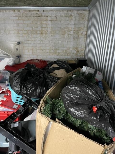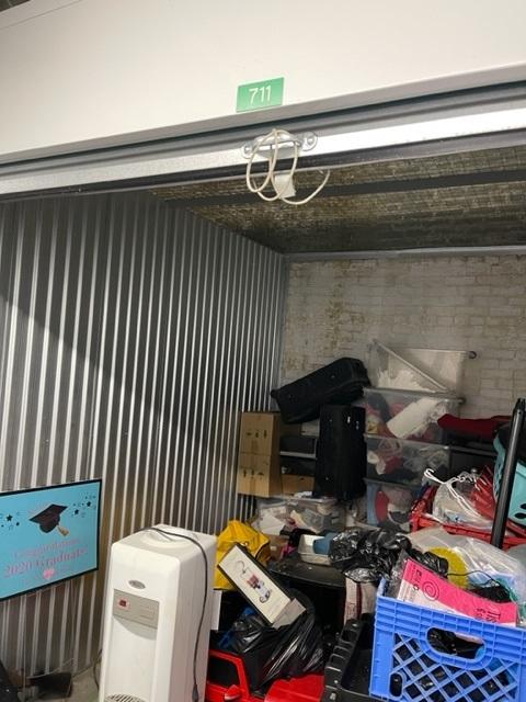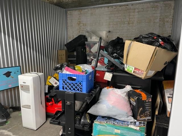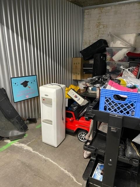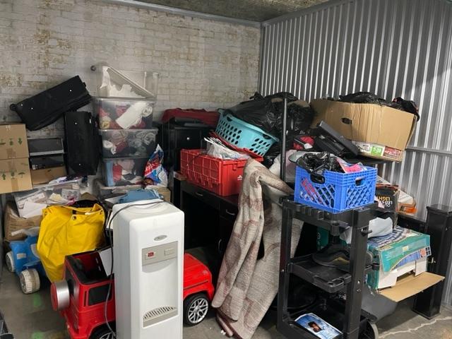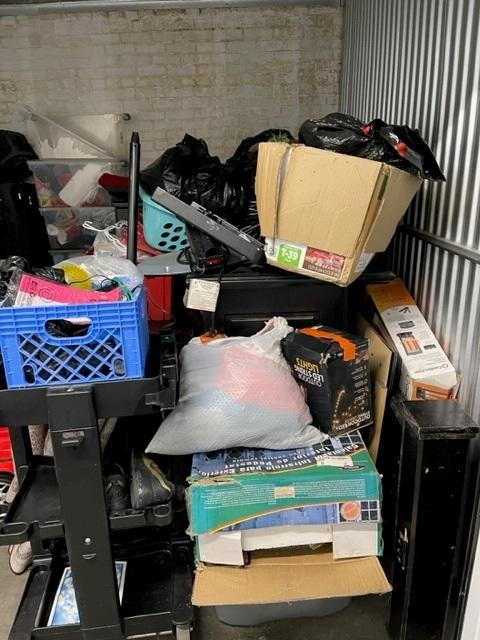 This unit appears to contain…Totes, power wheel, dresser, rug, bags, water cooler, TV