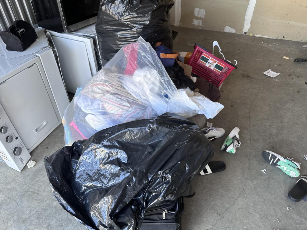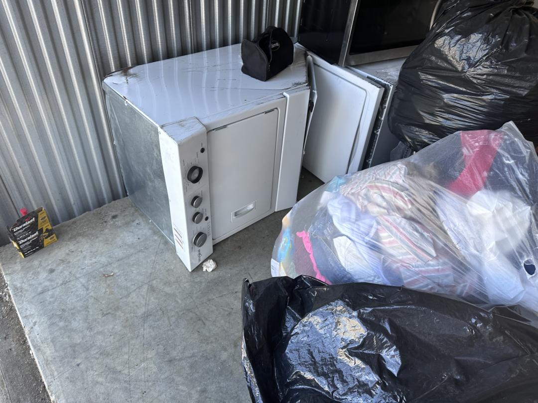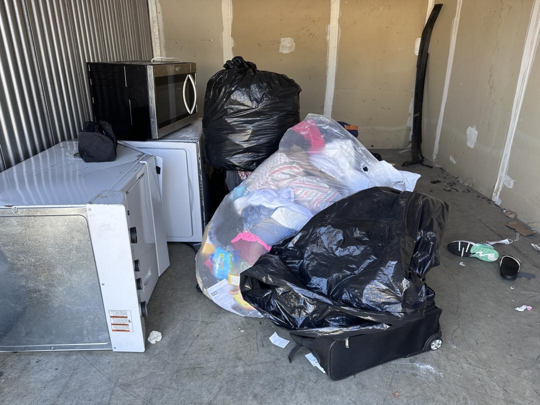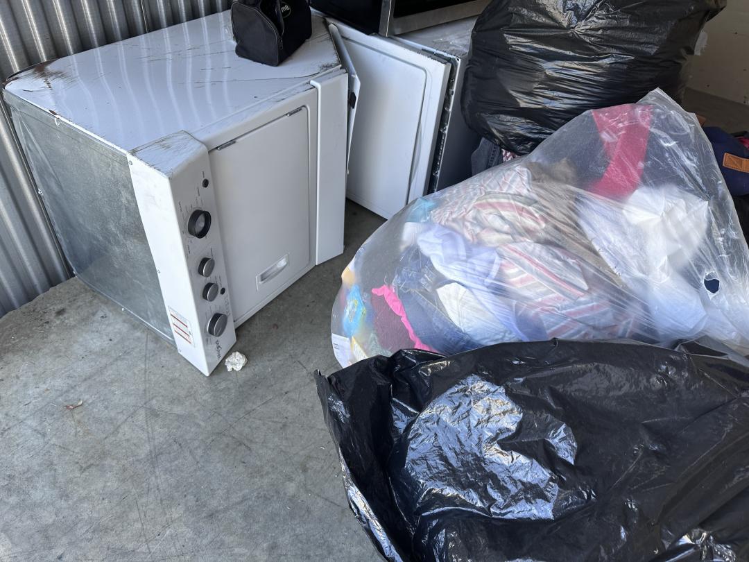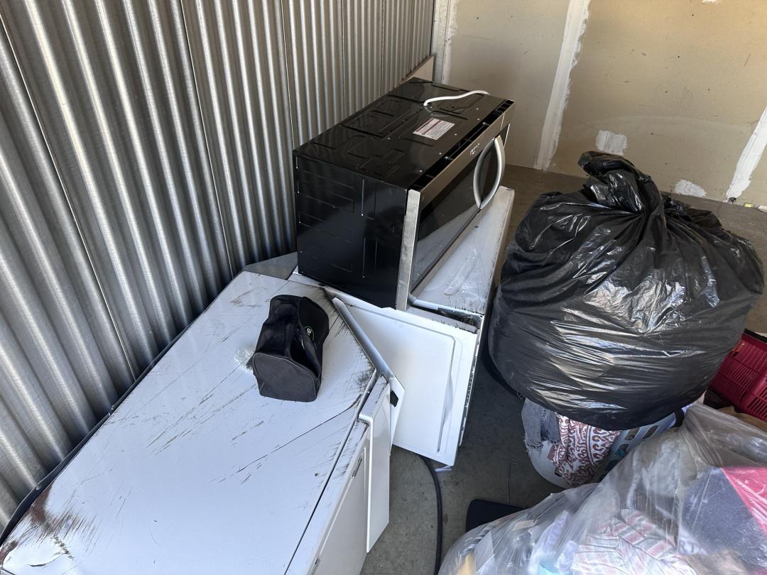 This unit appears to contain…Washing Machine,Dryer,Microwave,Plastic Bags,Plastic Containers,Misc. Boxes,Clothing,Misc. Items,Suitcases