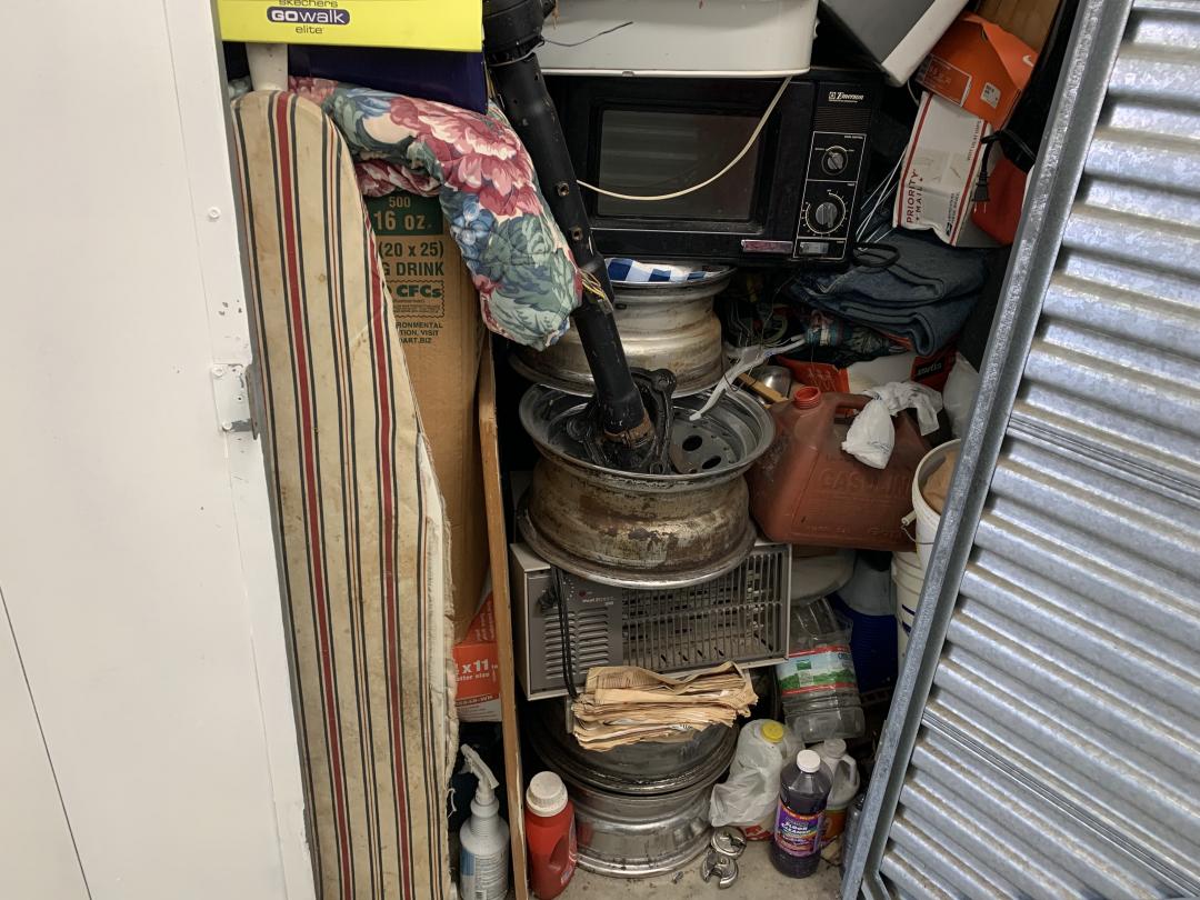 This unit appears to contain…Microwave, space heater, box fans, table top fan, 4 rims, coffee pot, steering column, folding chair, 2 wood chairs, boxes, mirror