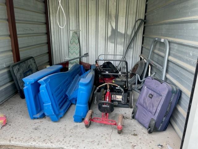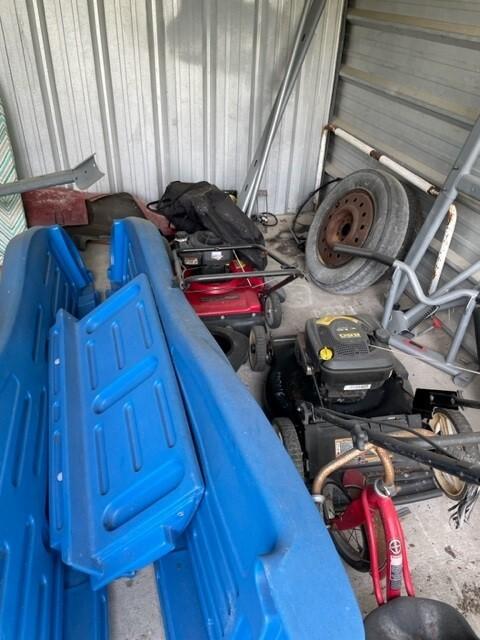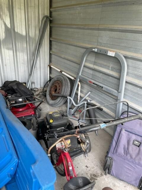 This unit appears to contain…Bicycle, Tire, lawn motor, tools