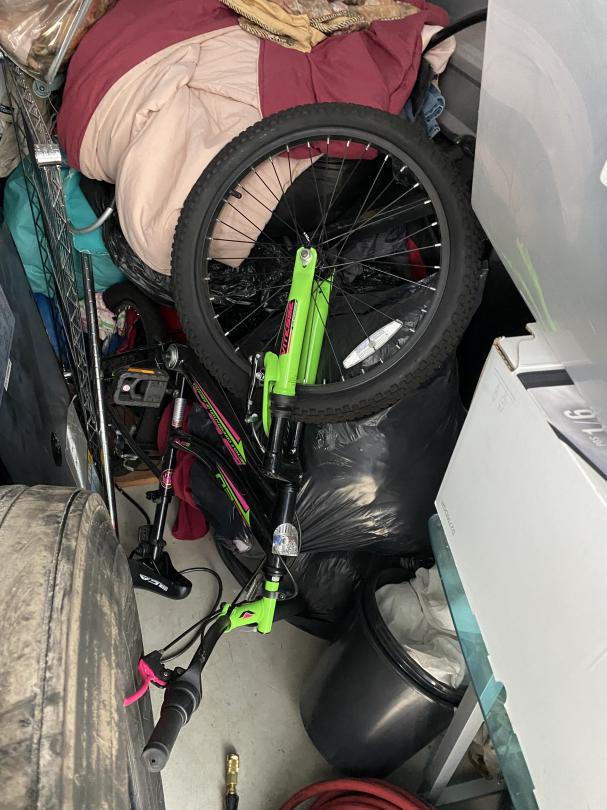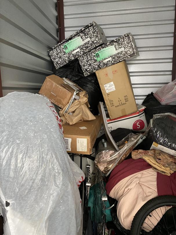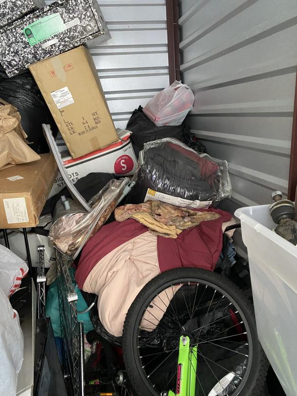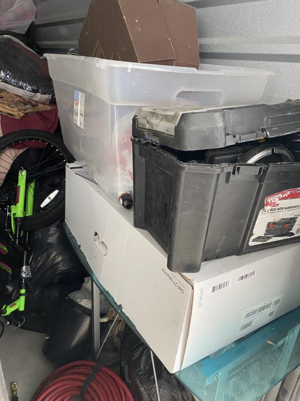 This unit appears to contain…Glass desk, tires,, toolbox, bike, wire rack shelves, boxes, bedding, bins, bags, hose