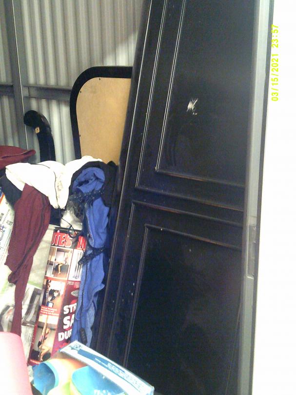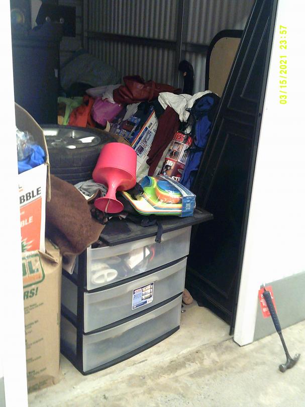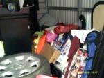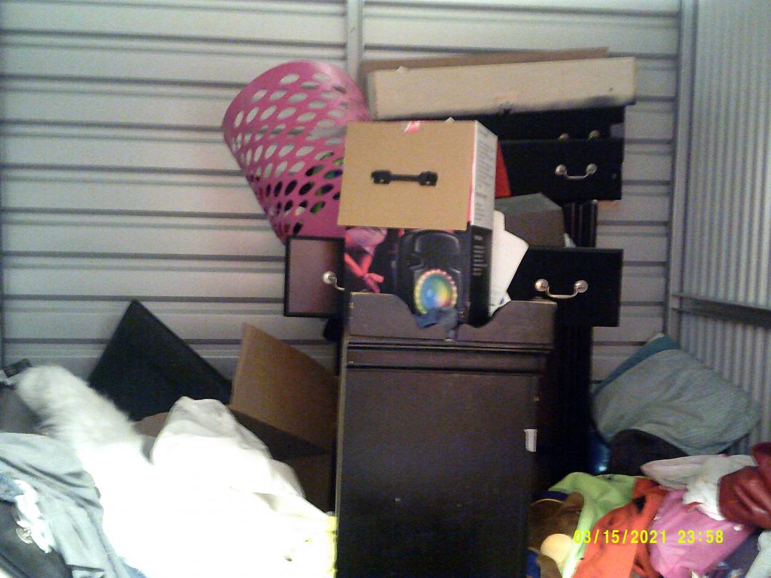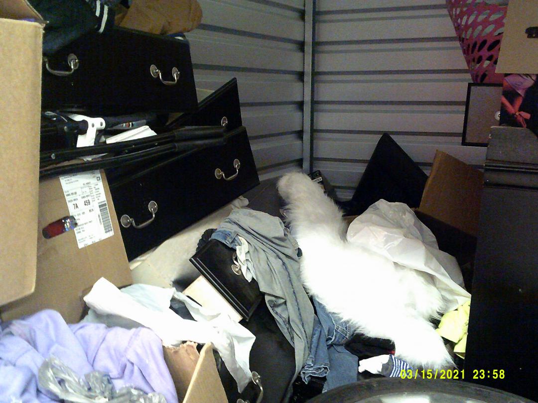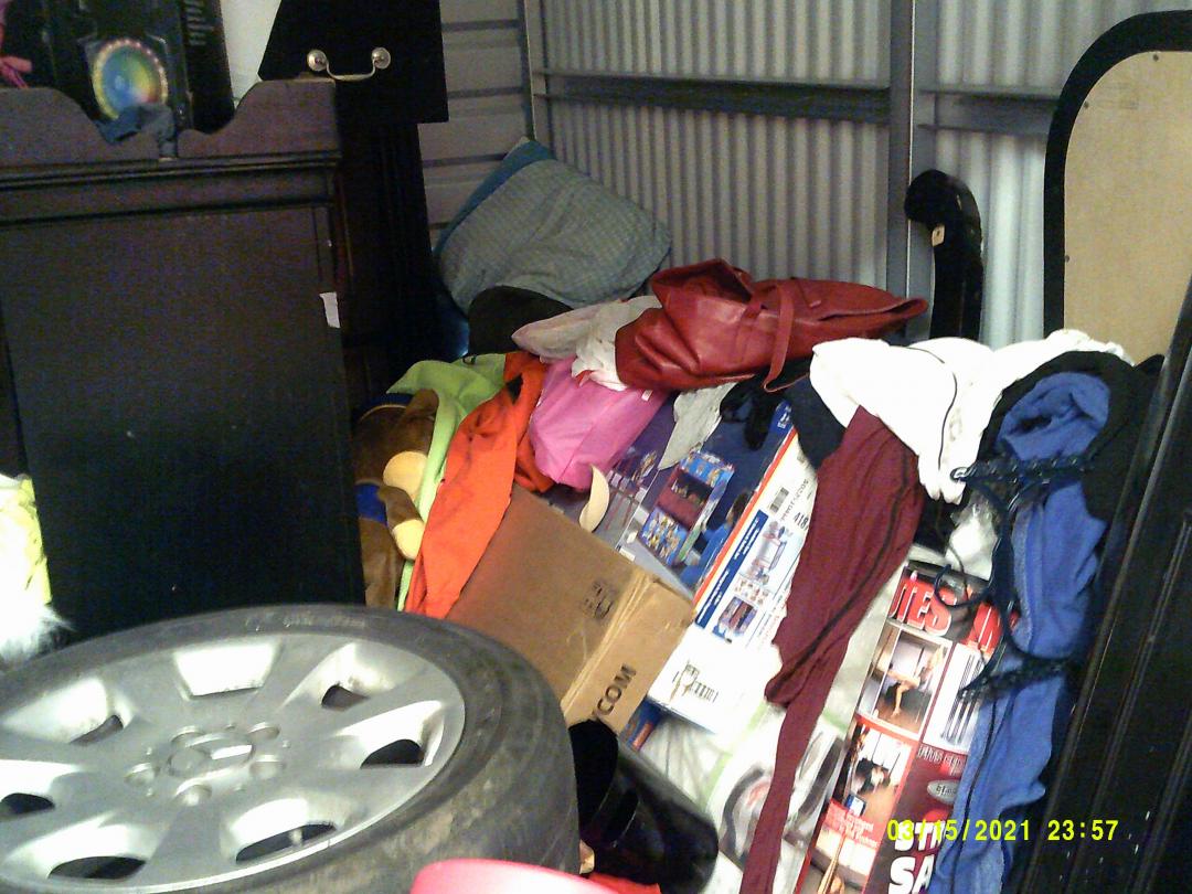 This unit appears to contain…READ ALL AUCTION RULES BEFORE BIDDING!!! Unit appears to contain: boxes, clothes, dressers, shelves, 4 tires and rims, headboard, dishes