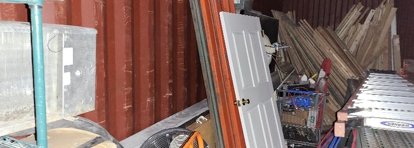 This unit appears to contain…Drive Up Access, Fenced & Gate, Security Cameras, 1st floor Plywood/door slab/drywall, Double bowl vanity top, 6' ladder, Wheel barrow, Foam insulation board, mini fridge, Lots of scaffolding, some sort of exhaust fan system