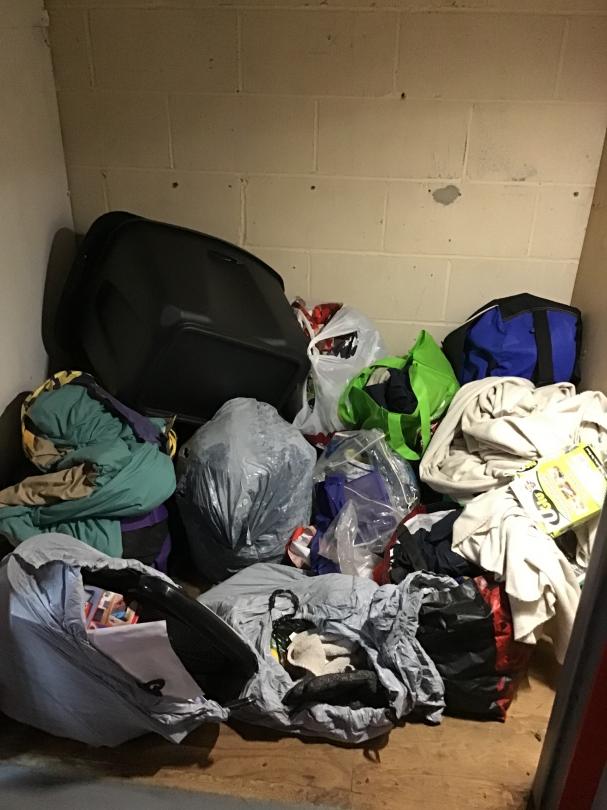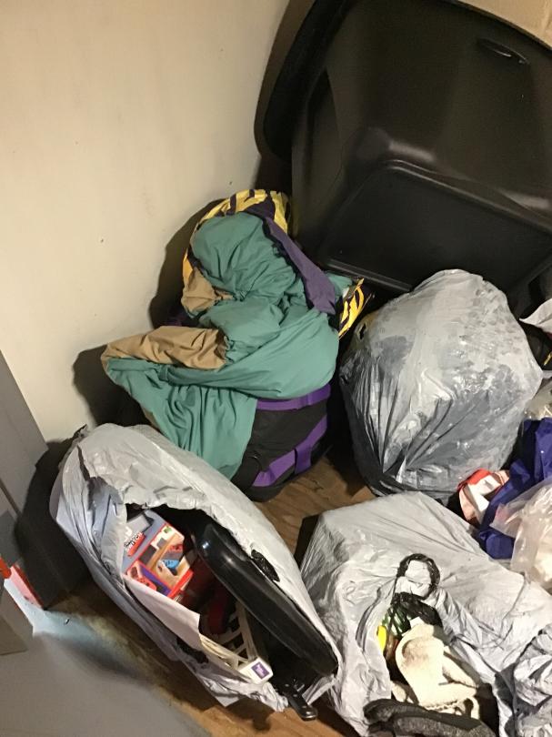 This unit appears to contain…4x4x6 Split Level 1st Floor Upper Level Stair Climate, unit appears to have bags of clothes and a tote