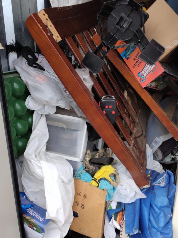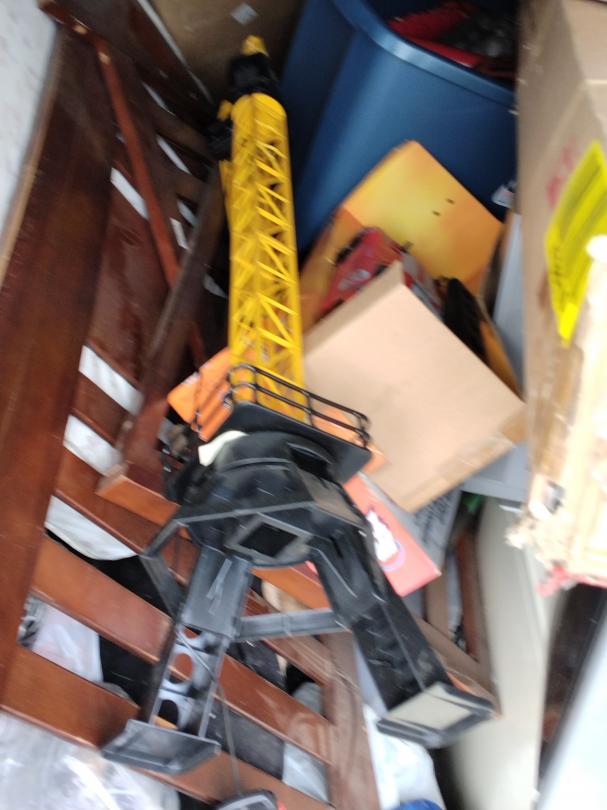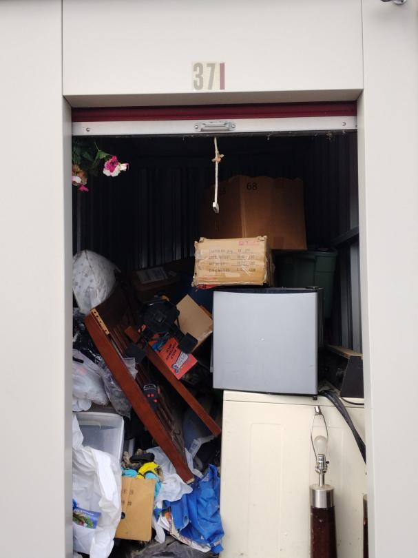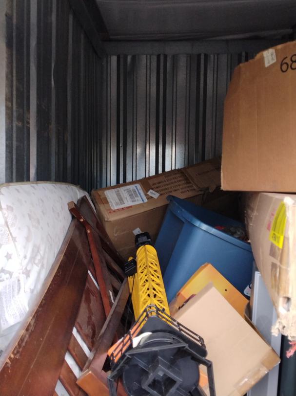 This unit appears to contain…This unit contains Bags, Boxes, Lamps, TV, Mini Fridge, Plastic Storage, Toy cars, Crib w/ mattress, totes.