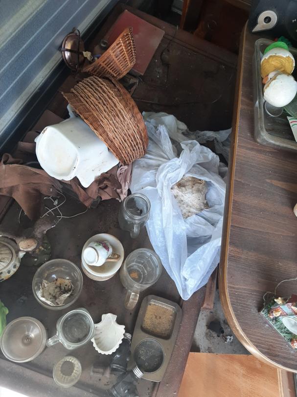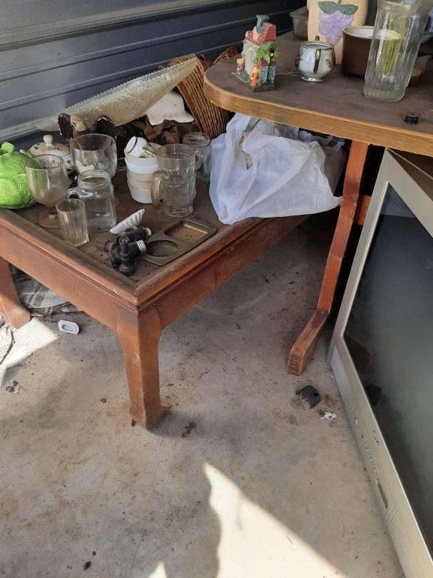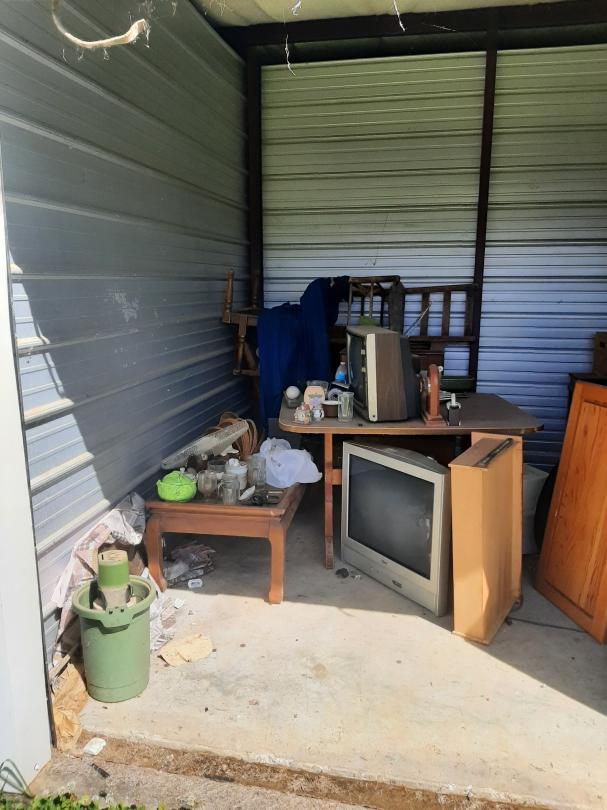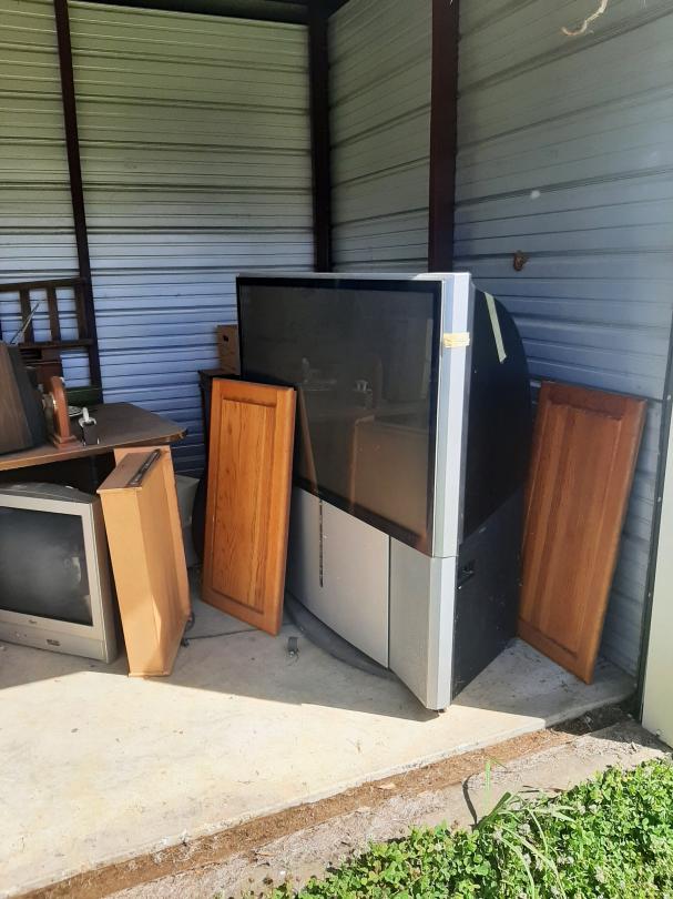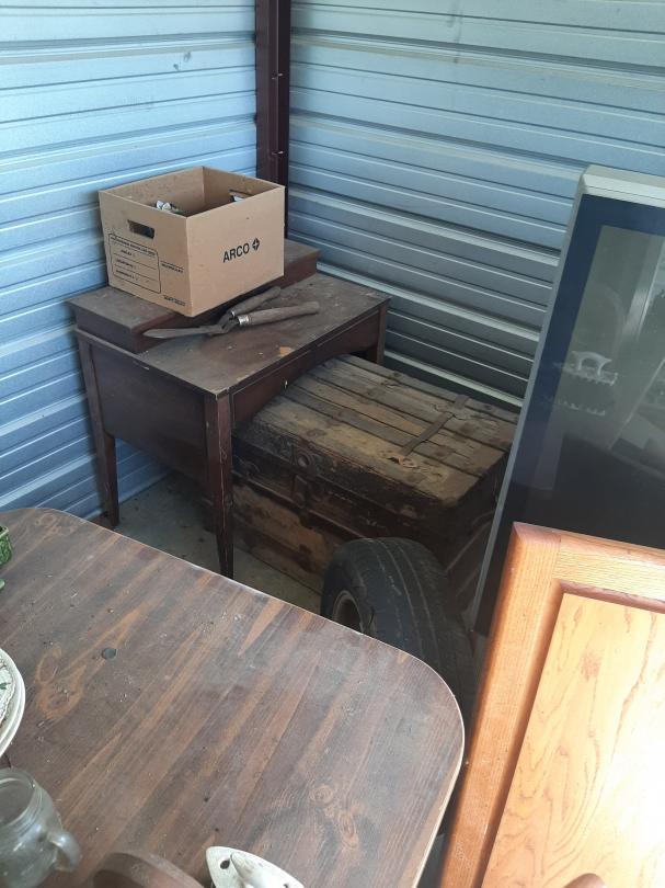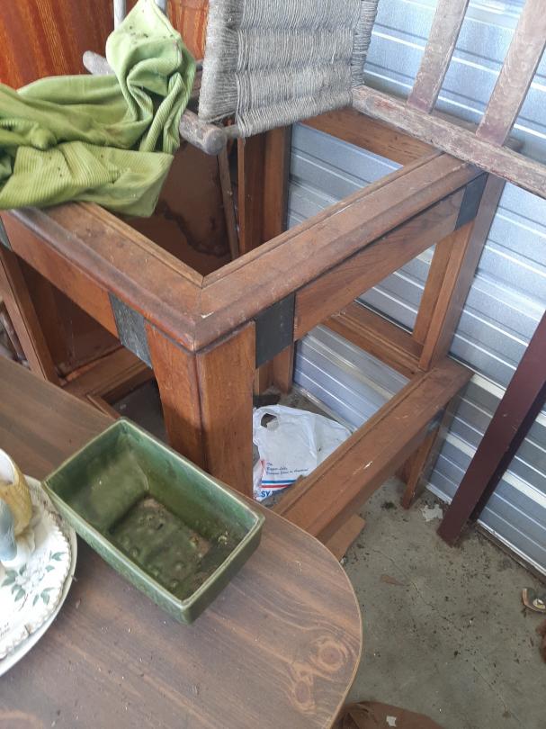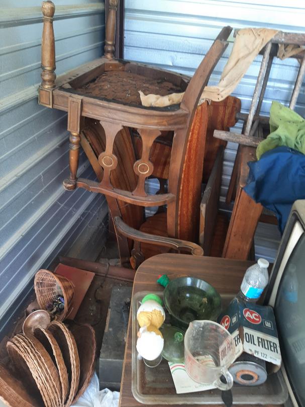 This unit appears to contain…TVs, coffee table, dinner table, chest, end table, chairs, misc