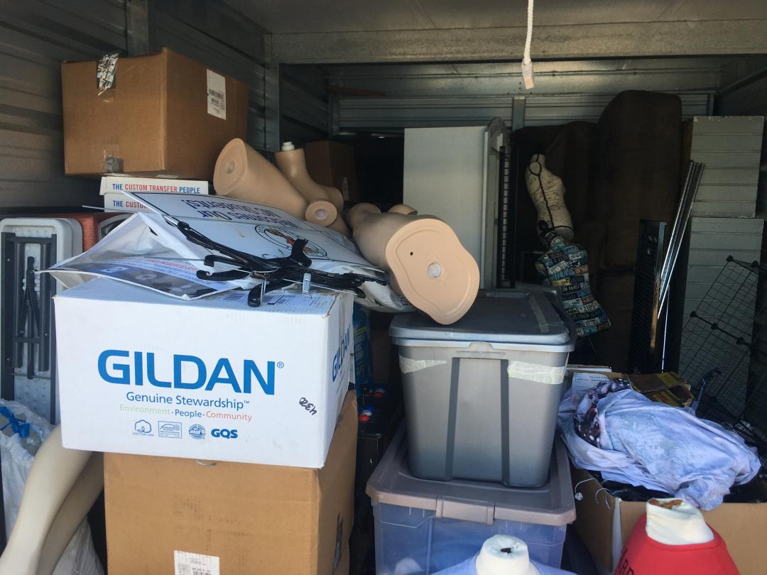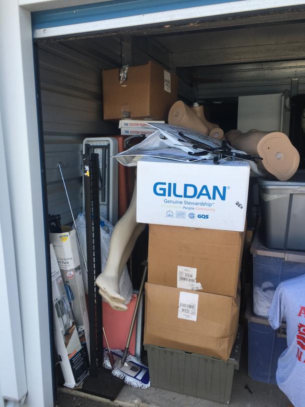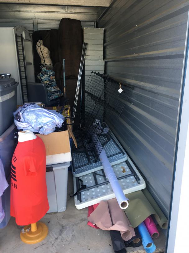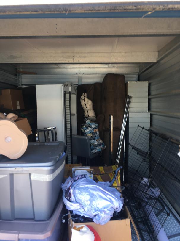 This unit appears to contain…Mannequins, 2 Folding Tables, 2 Small Folding Tables, Clothes Rack, Bench, Misc Boxes, 3 Shelves, Misc Totes, Misc Boxes, Metal Racks, Couch, Love Seat, Bar Stool Arcade Game, Rolls of Paper, Wooden Shelves