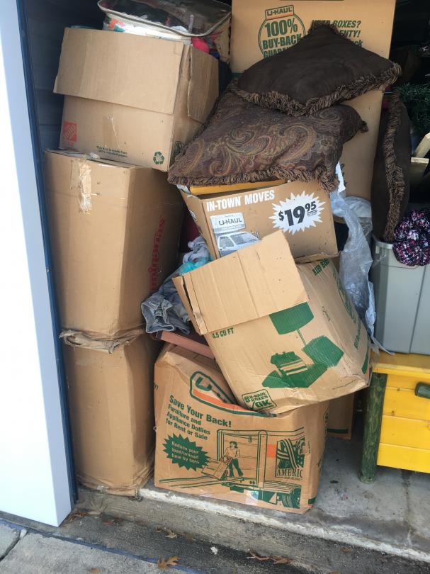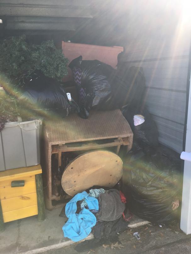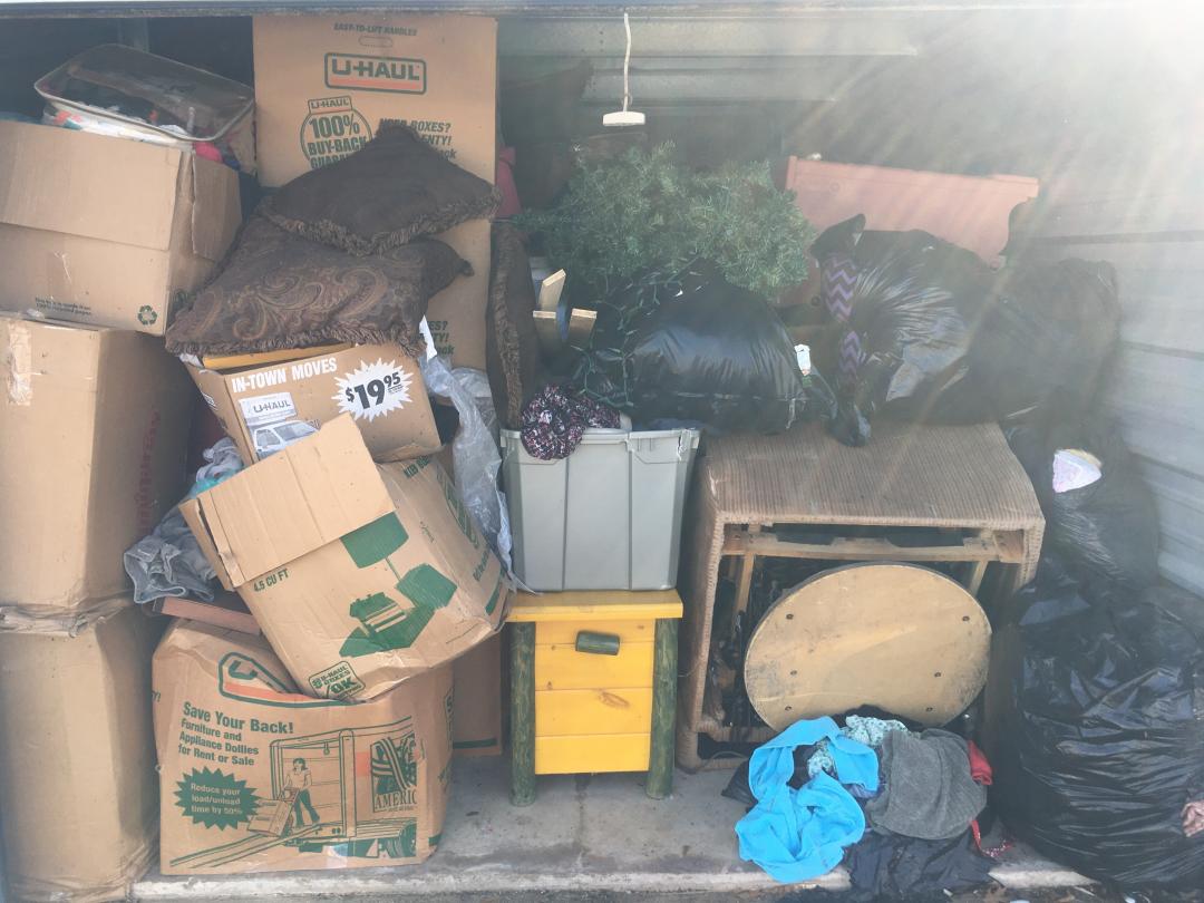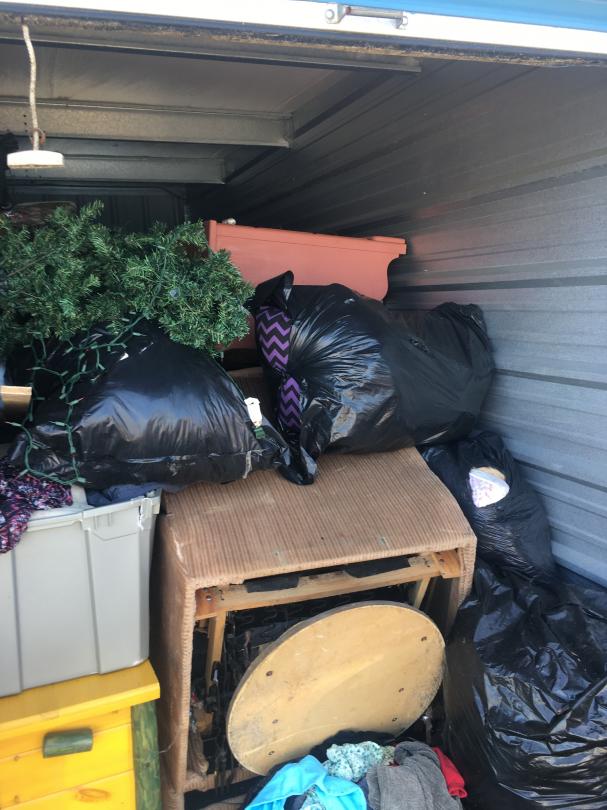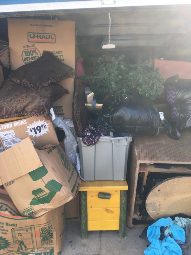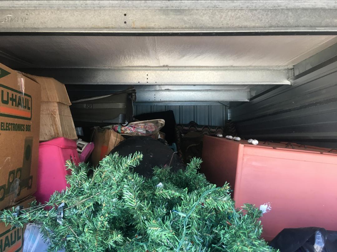 This unit appears to contain…Misc Bags, Misc Boxes, Pre-lit Christmas Tree, Wooden Chest, Recliner, 2 Couches, Dresser, Luggage, Kid's Toys.