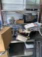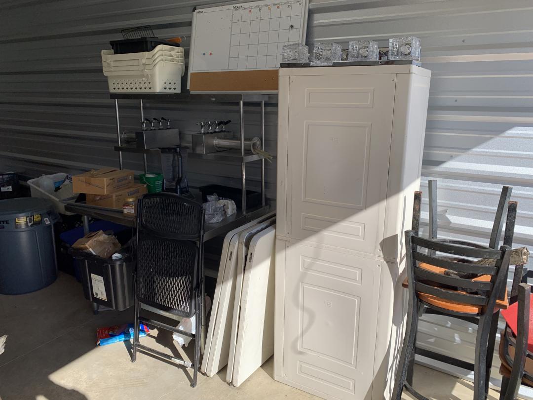 This unit appears to contain…Chairs, Restaurant Equipment, Baking Pans. Commercial Mixer, Beer Taps, Warming Cabinet. Heavy Duty Totes, Garbage Cans, Pots and Pans, Blenders, Bulk Tea Bags, Boxes, Shelves, Receipt Printer