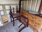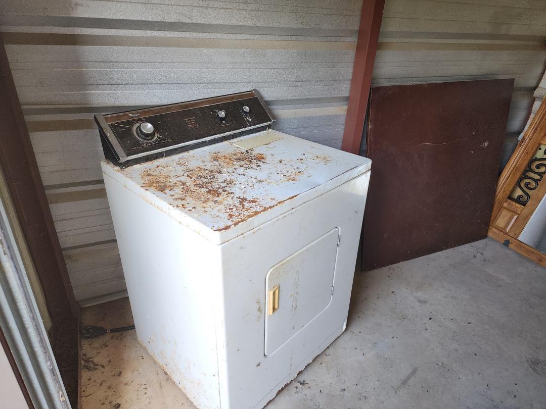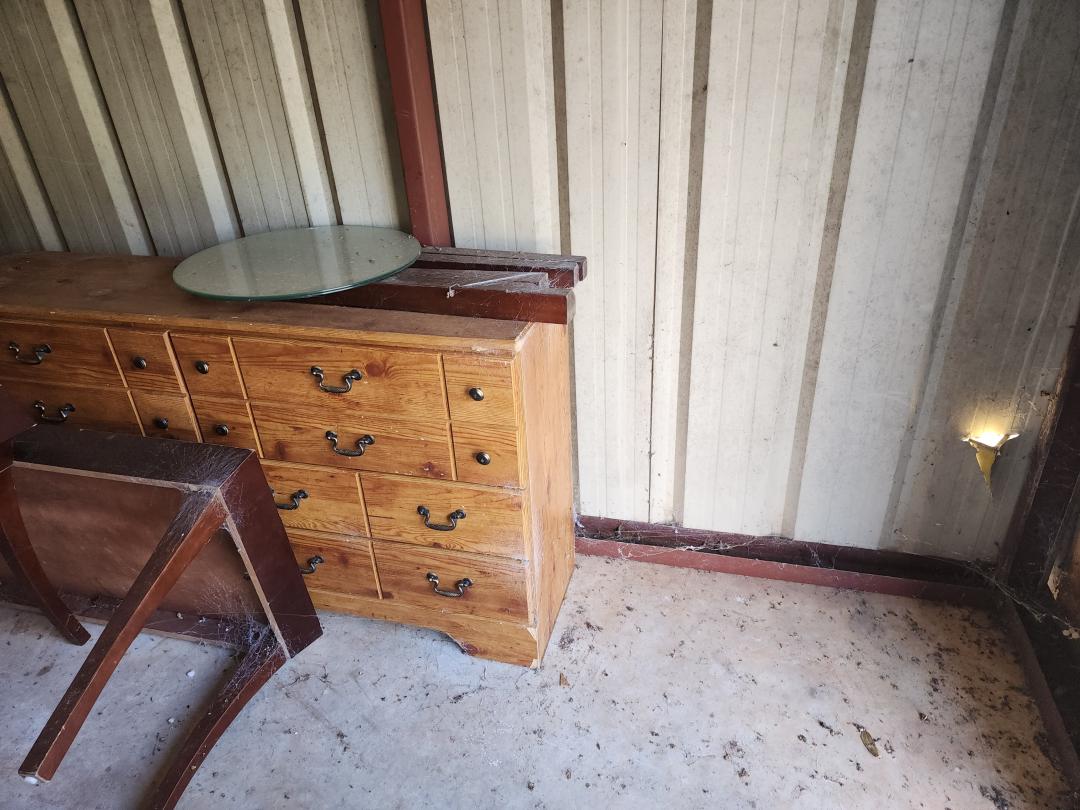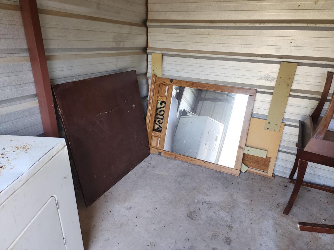 This unit appears to contain…Dresser, end tables, coffee table, table top w legs, mirrors, rusty dryer (we have salvage firm that will take that if not desired)