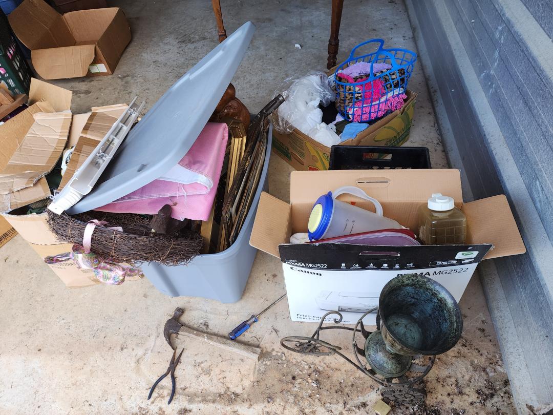This unit appears to contain…Mirror, dishes, table, angle statue, chair, misc items