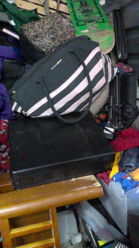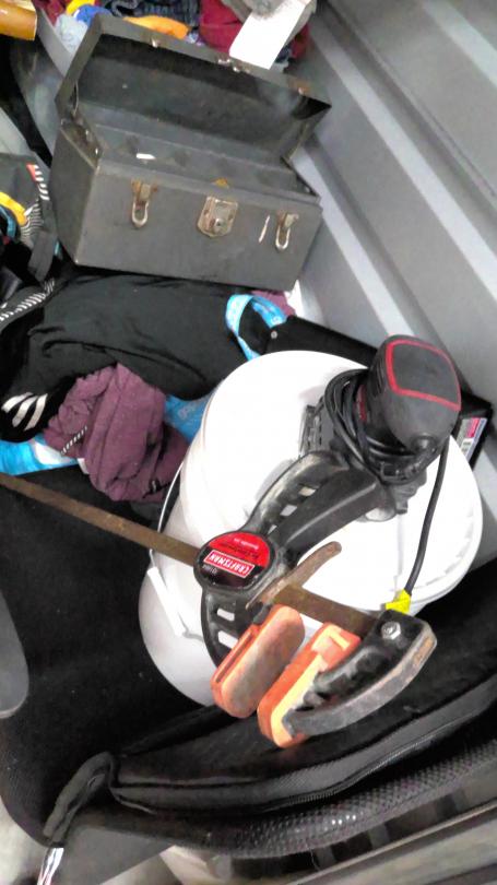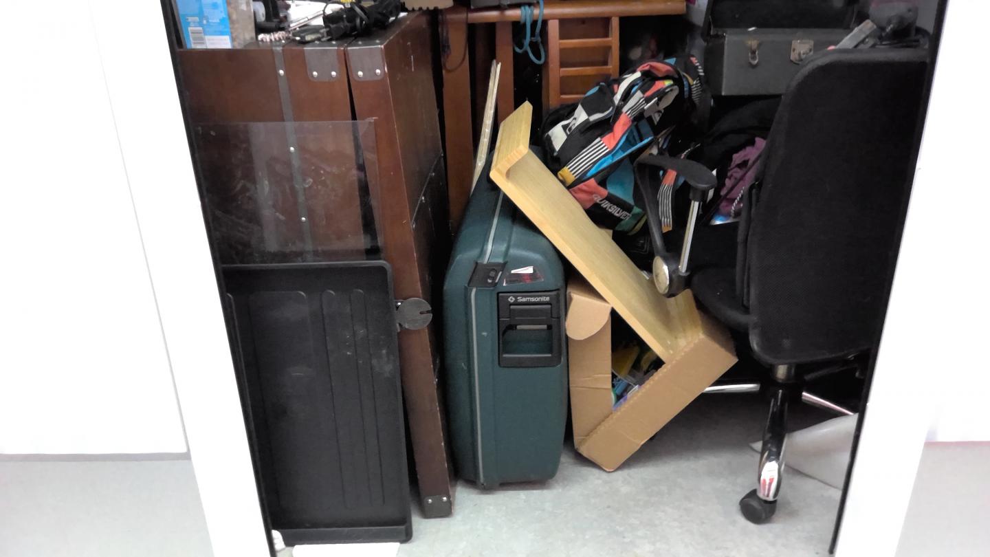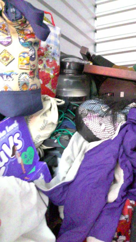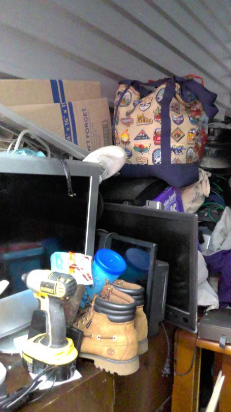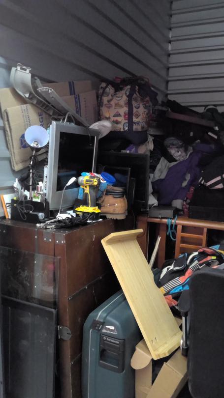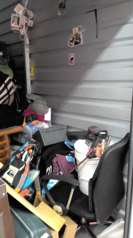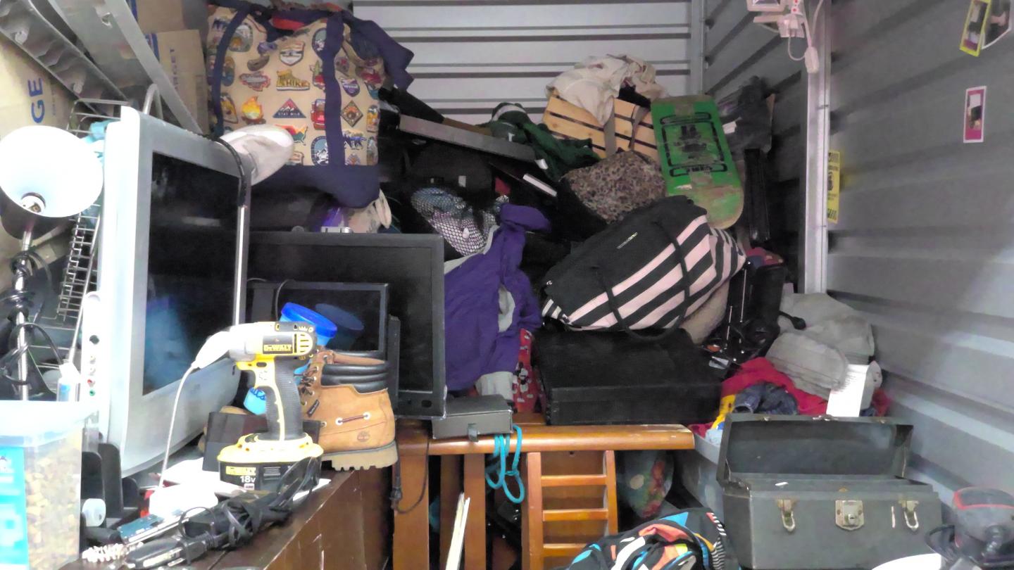This unit appears to contain…Trunks /Table frame and glass/ Computers /Tools /Lights /Bugs /Kitchen & Household Items /Chair /Luggage and Boots size 10