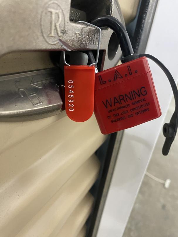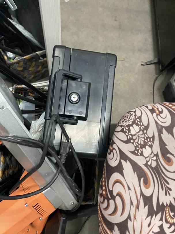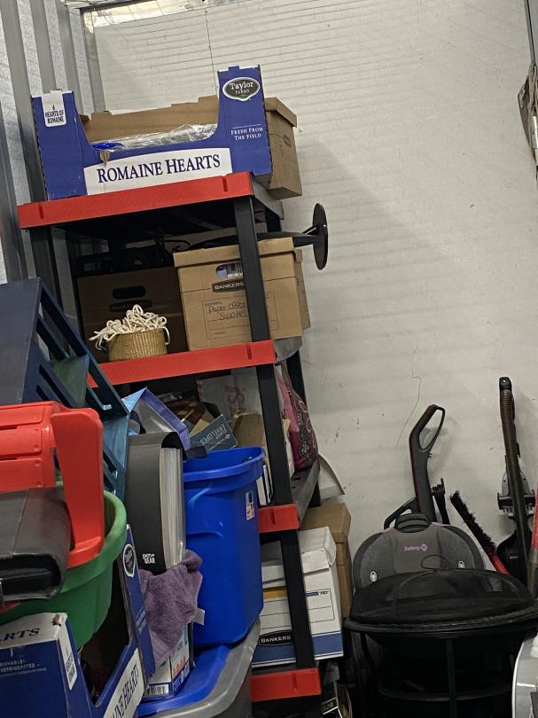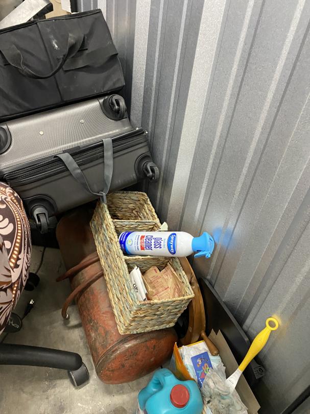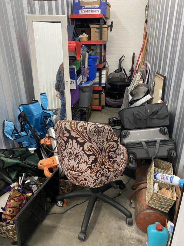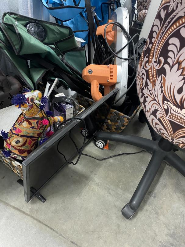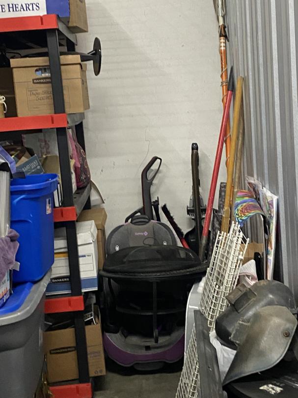 This unit appears to contain…Drive-Through Heated TV, chair, safe, suit case, compressor, trunk, boxes, bins, vacuum, shelf, fans, paper shredder
